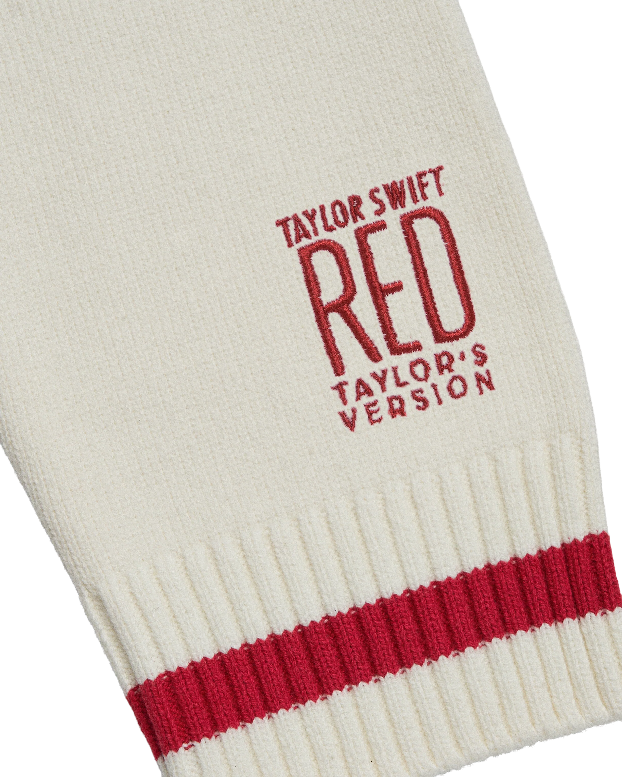 Pull tricoté blanc avec bordures rouges, comportant le logo "A lot going on at the moment" sur le devant, avec "A Lot" en lurex rouge, et le logo de l’album "Red Taylor’s Version" brodé sur la manche gauche du porteur en rouge.