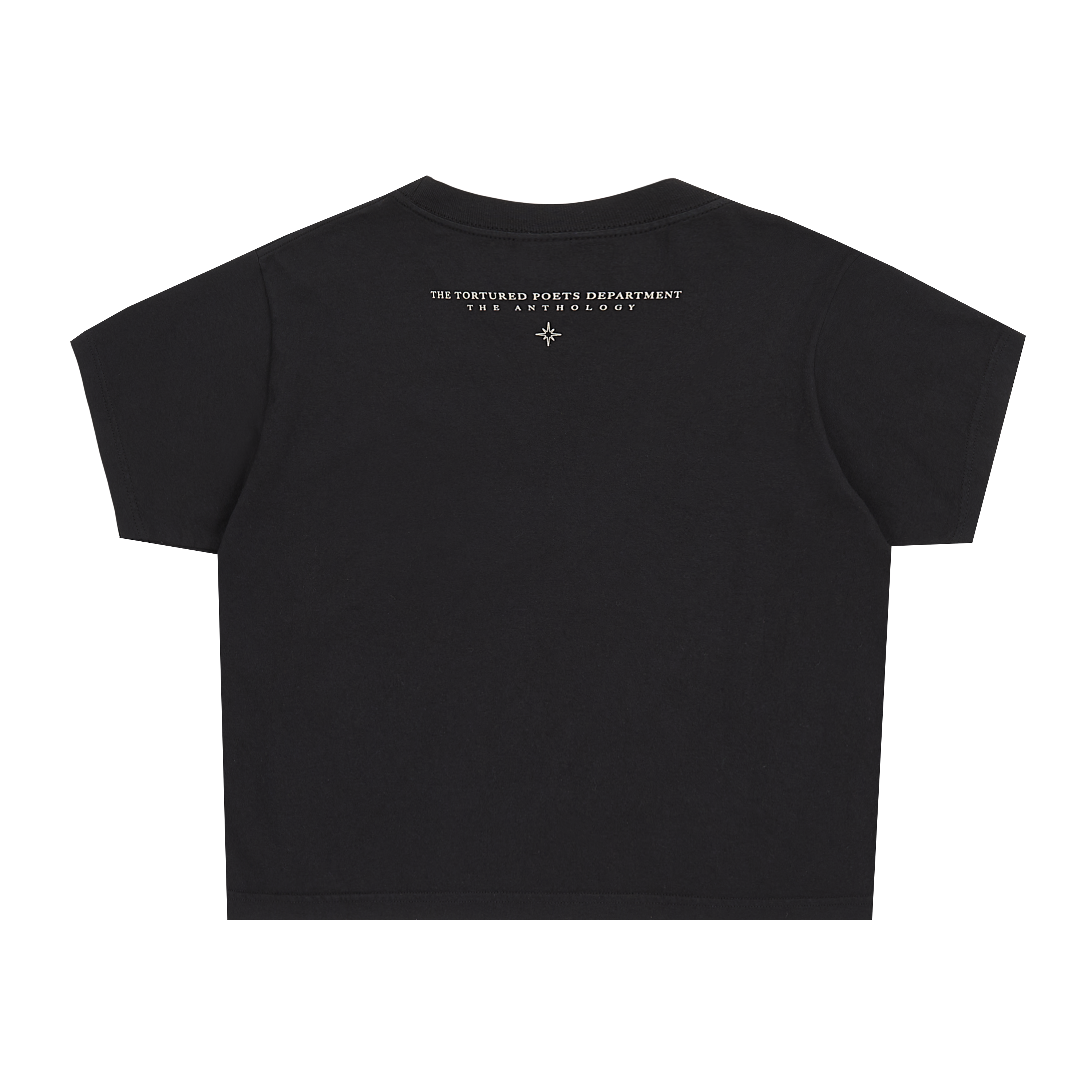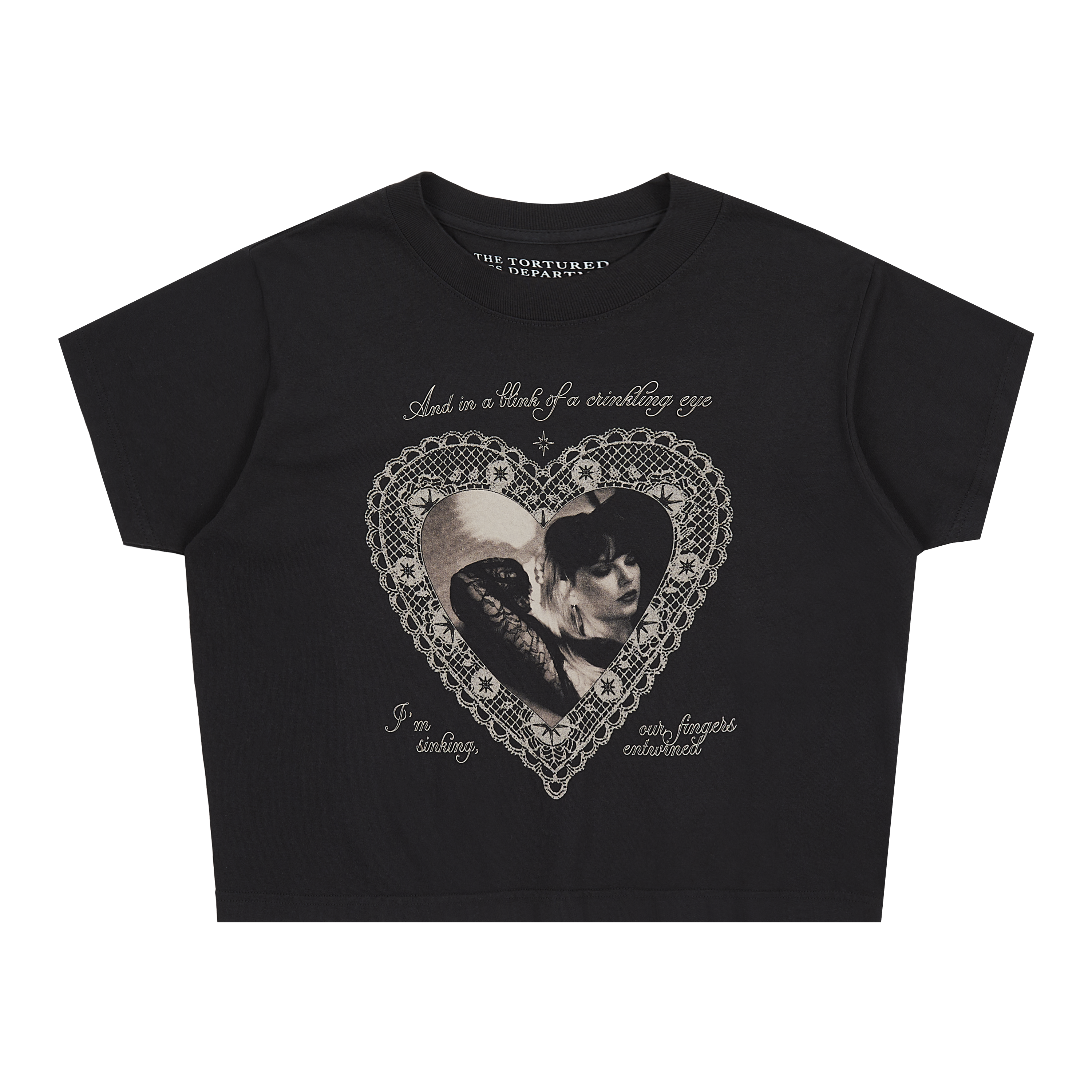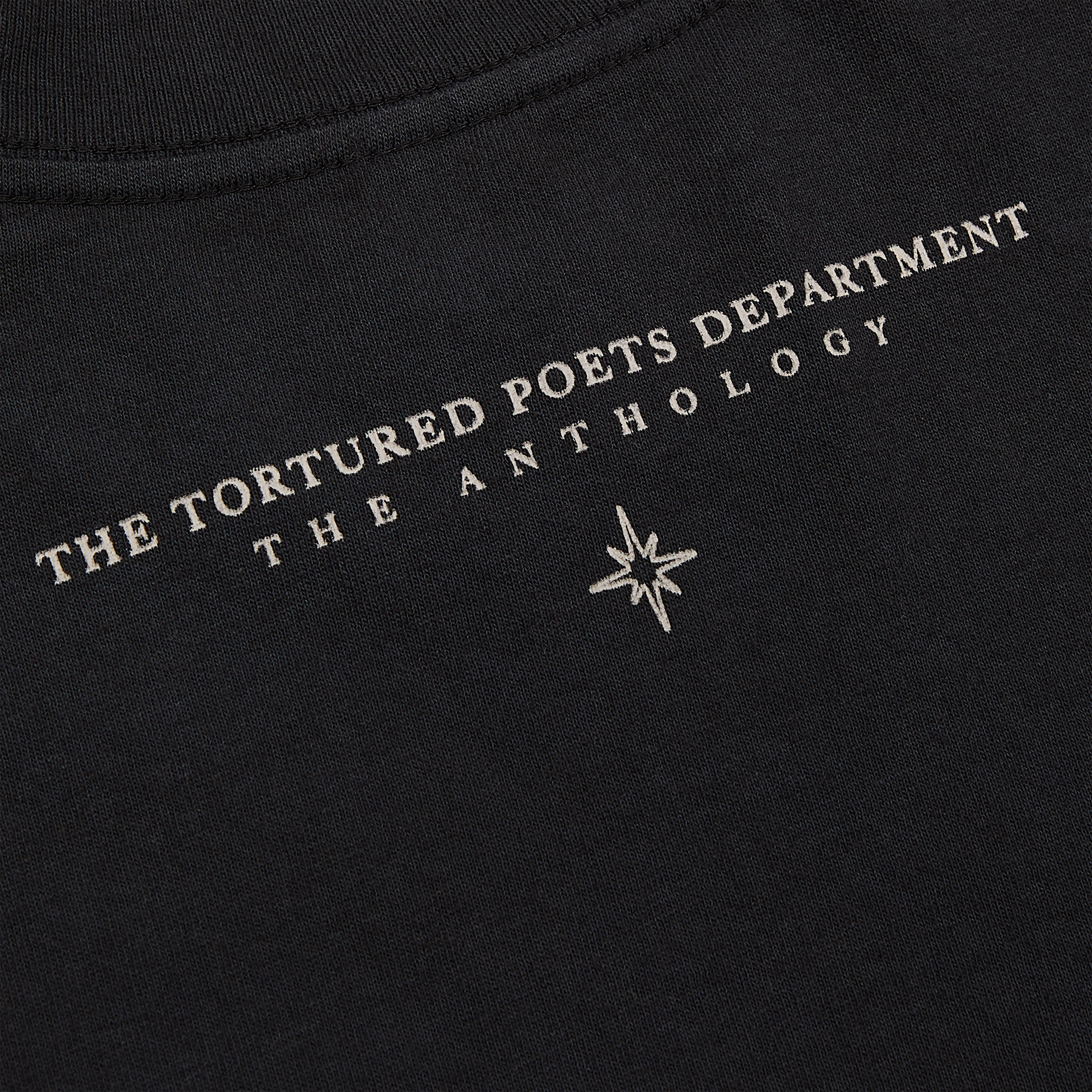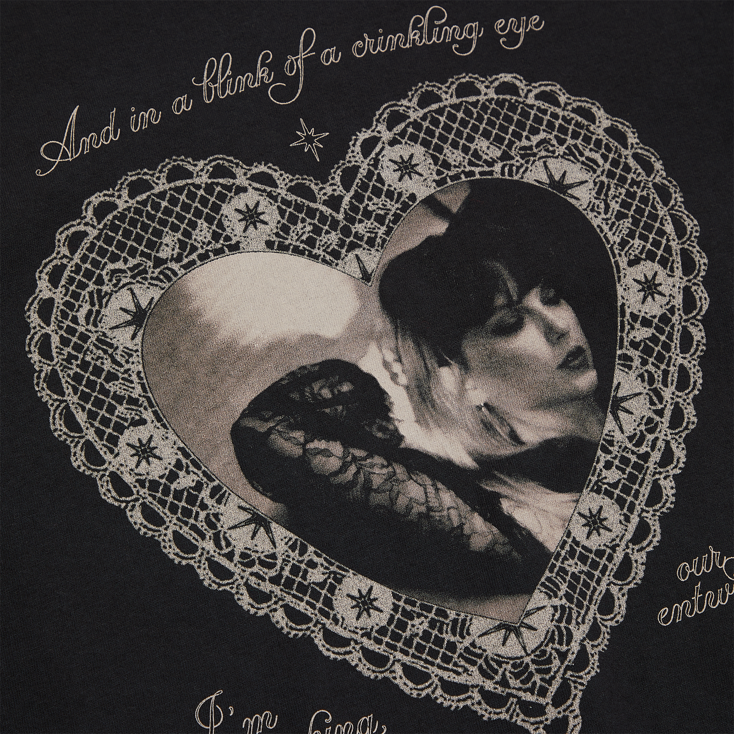 T-shirt court noir avec les paroles des chansons « And in a blink of a crinkling eye » et « I'm sinking our fingers entwined » avec une photo de Taylor Swift et un motif cœur imprimés sur le devant et le titre de l'album « The Tortured Poets Department The Anthology » et un motif étoile imprimés au dos.