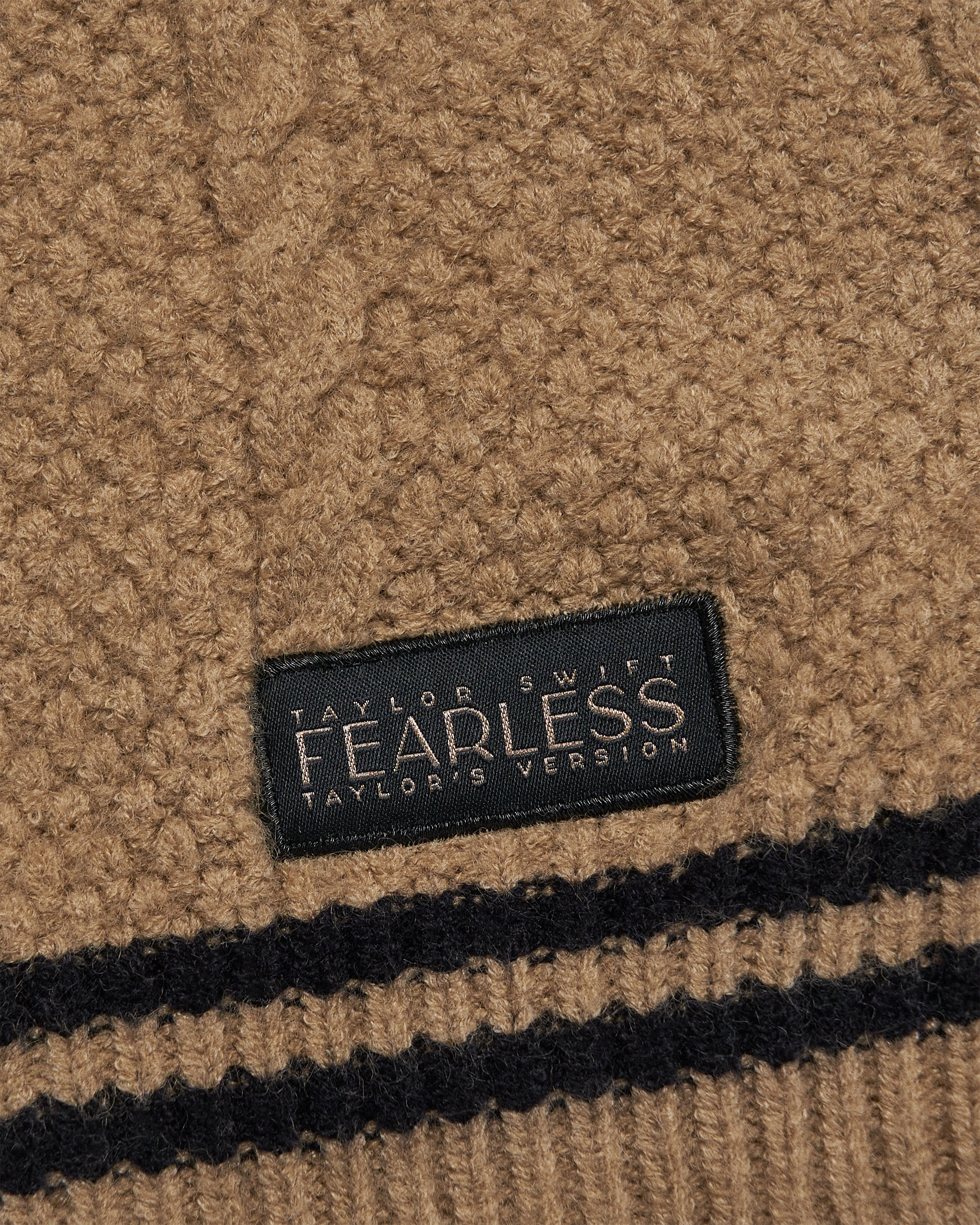 Cardigan marron doré à trois boutons en maille torsadée, orné de rayures noires et d'étoiles brodées noires sur le devant et le dos. Étiquette tissée « Taylor Swift Fearless Taylor's Version » sur la hanche gauche côté porteur.