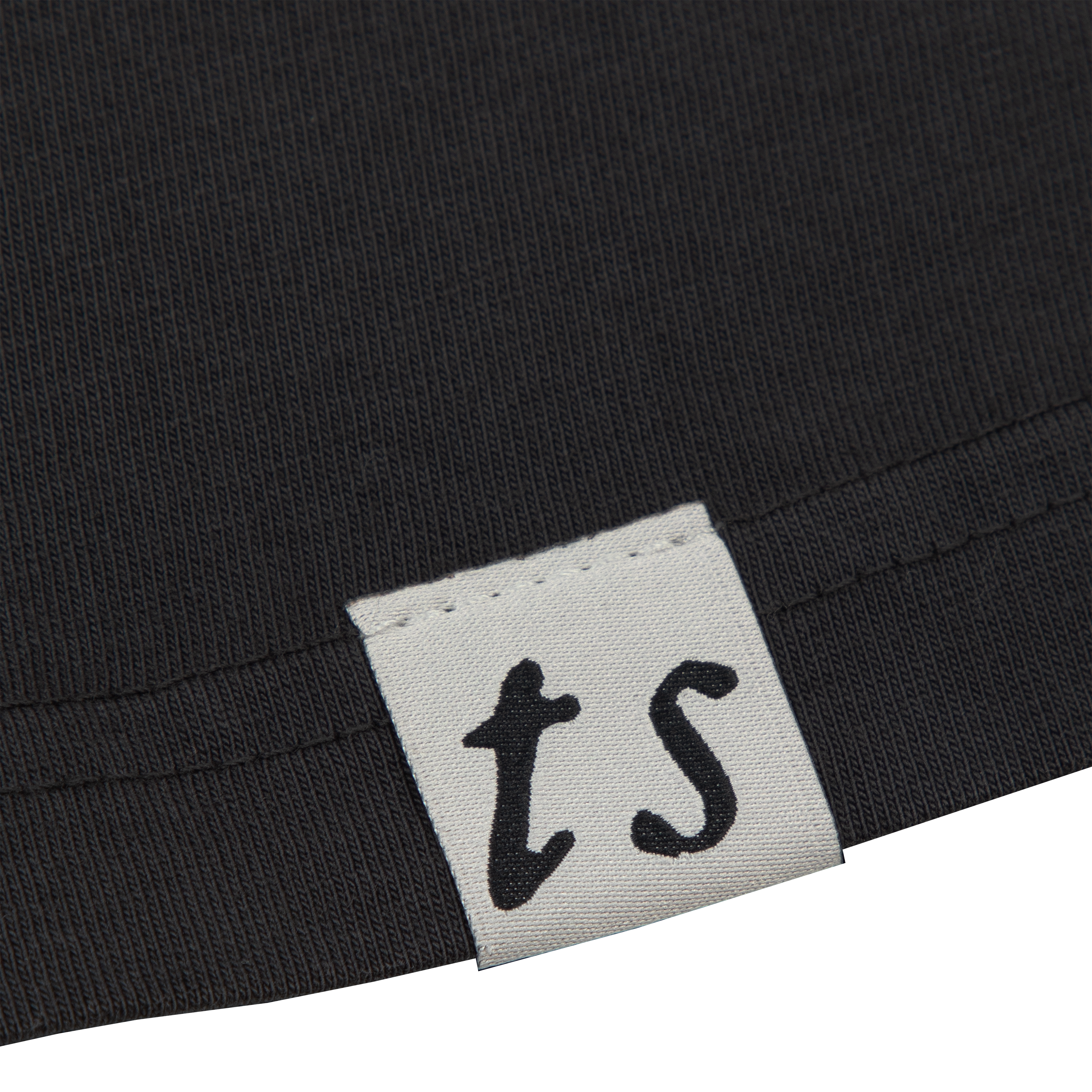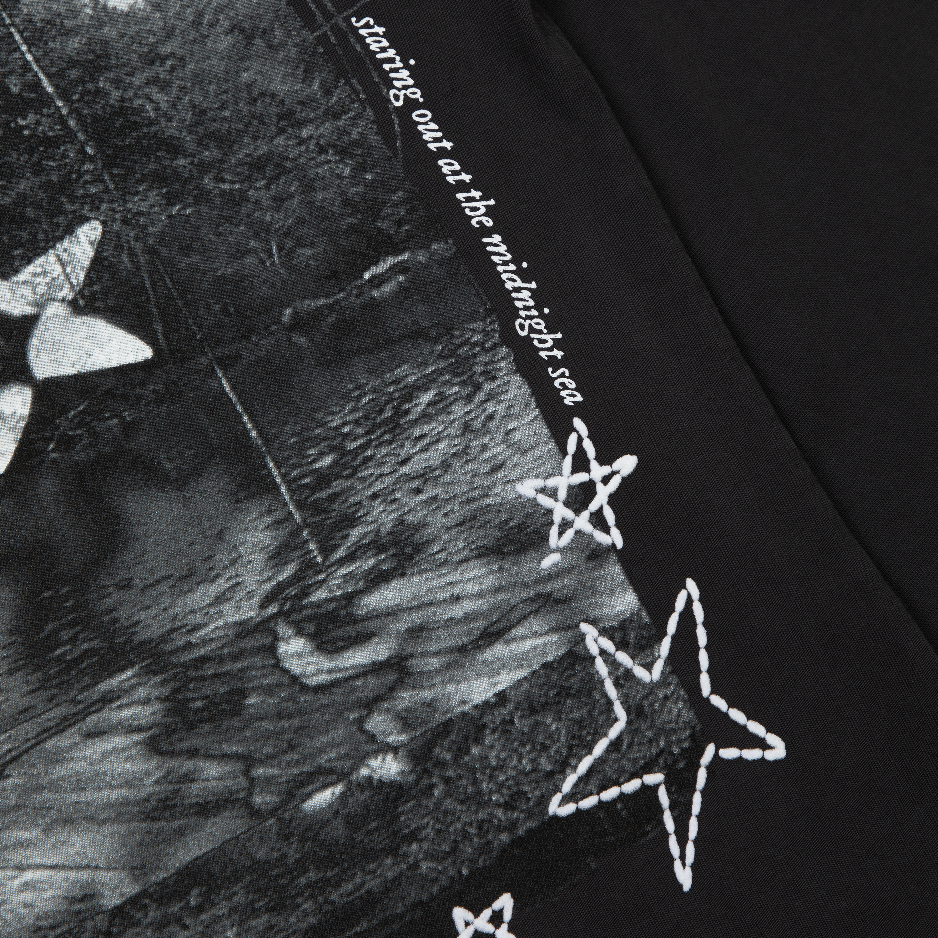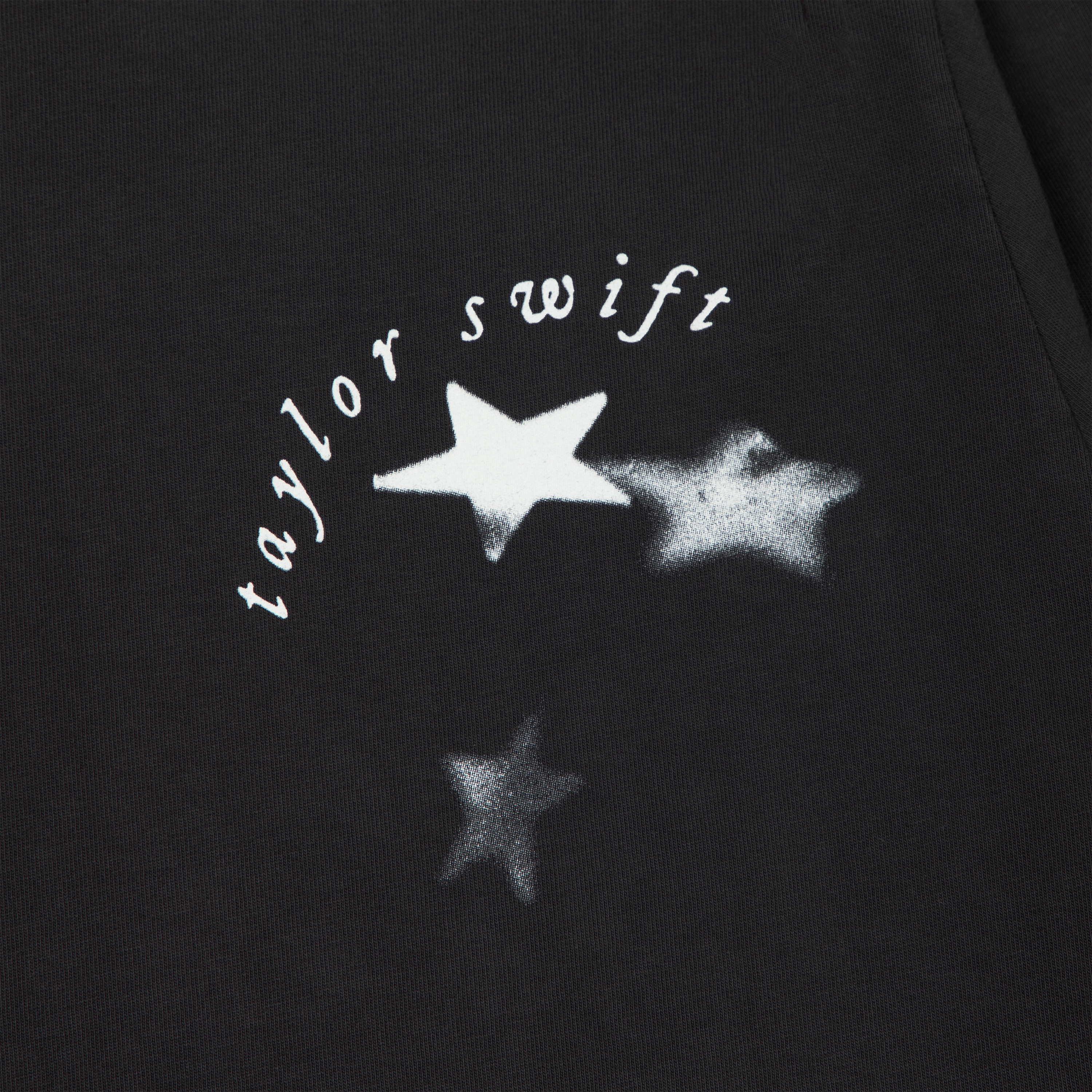T-shirt gris à manches longues avec le mot « Taylor Swift » avec un motif en étoile imprimé sur le devant gauche de la poitrine du porteur avec un patch « ts » cousu sur l'ourlet avant droit du porteur et une photo de Taylor Swift et les paroles de la chanson « they say she was seen on occasion,pacing the rocks, staring out at the midnight sea » avec un motif en étoile imprimé au dos.
