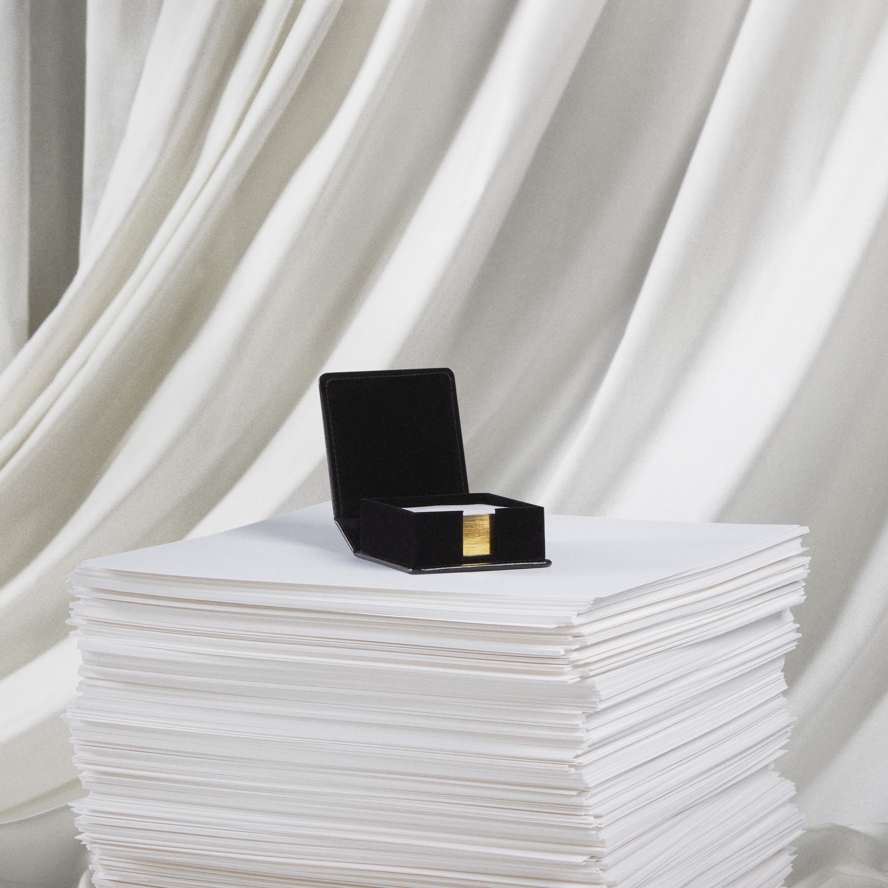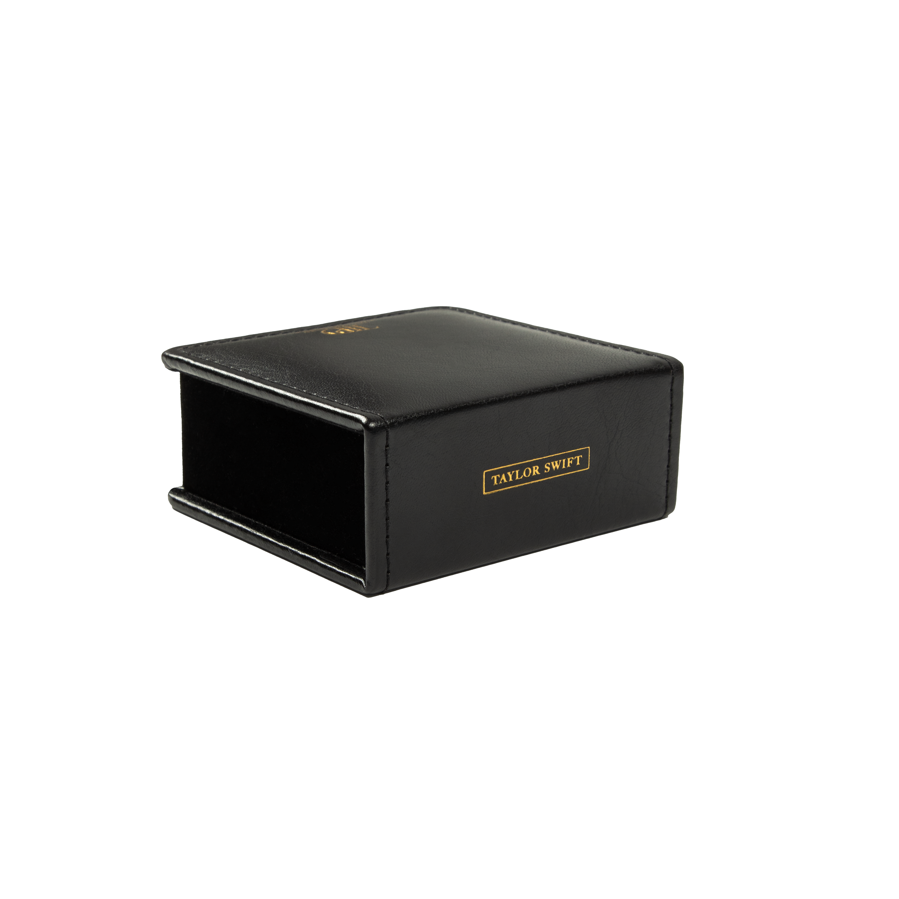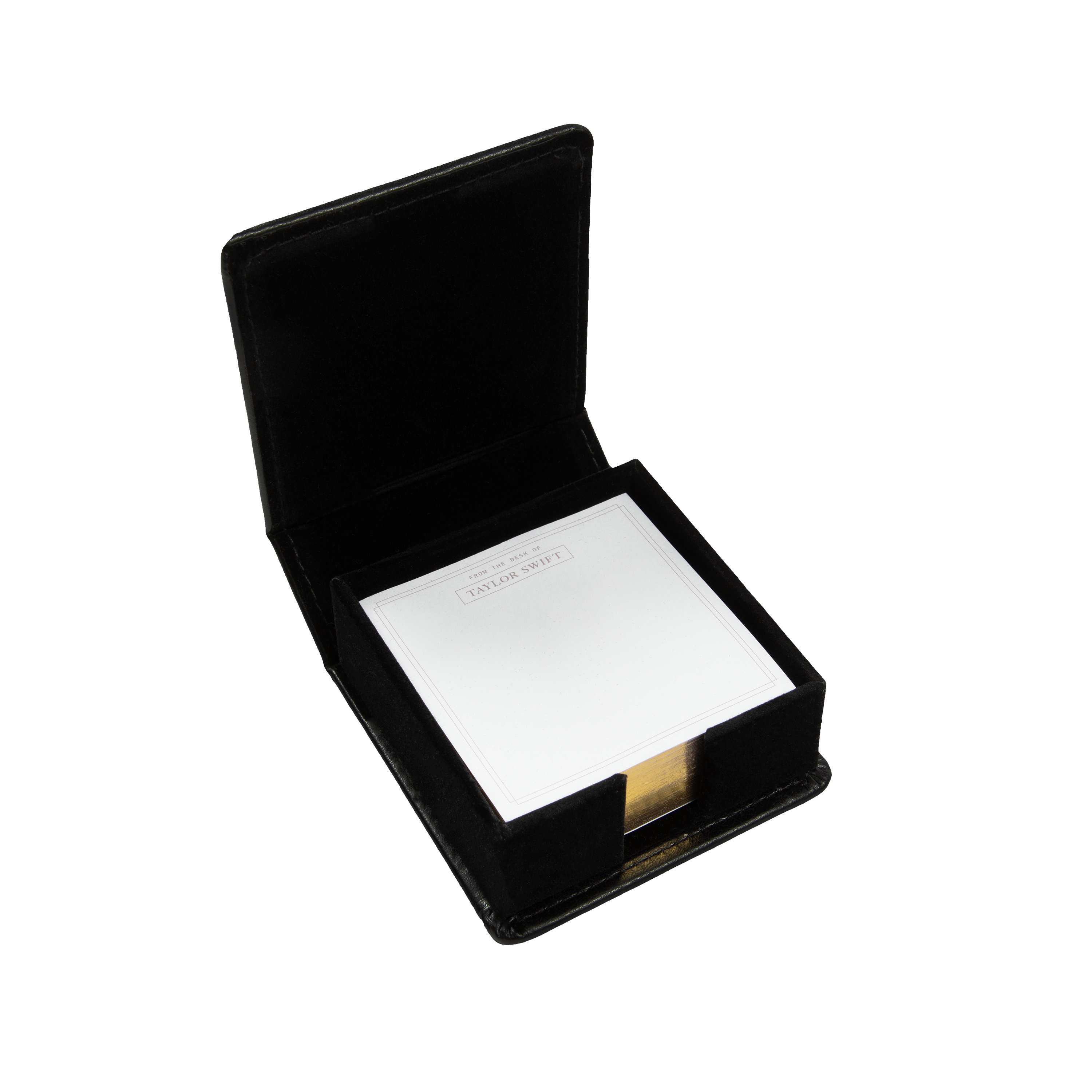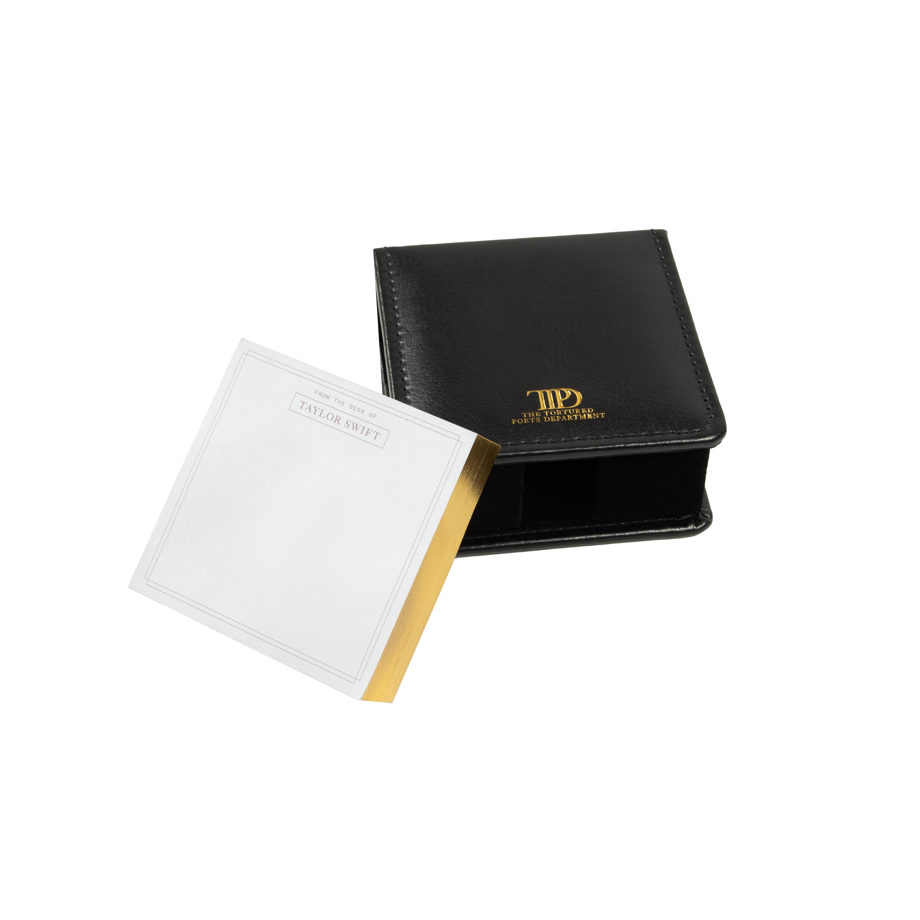 Bloc-notes adhésif de couleur crème avec un design à double ligne et "From The Desk Of" et "Taylor Swift" avec un motif encadré imprimé sur le haut de chaque page du bloc-notes et porte-notes en cuir noir avec le "TTPD" album logo et "The Tortured Poets Department" imprimés sur le devant en feuille d'or et "Taylor Swift" avec une un design encadré imprimé sur le dos en feuille d'or.