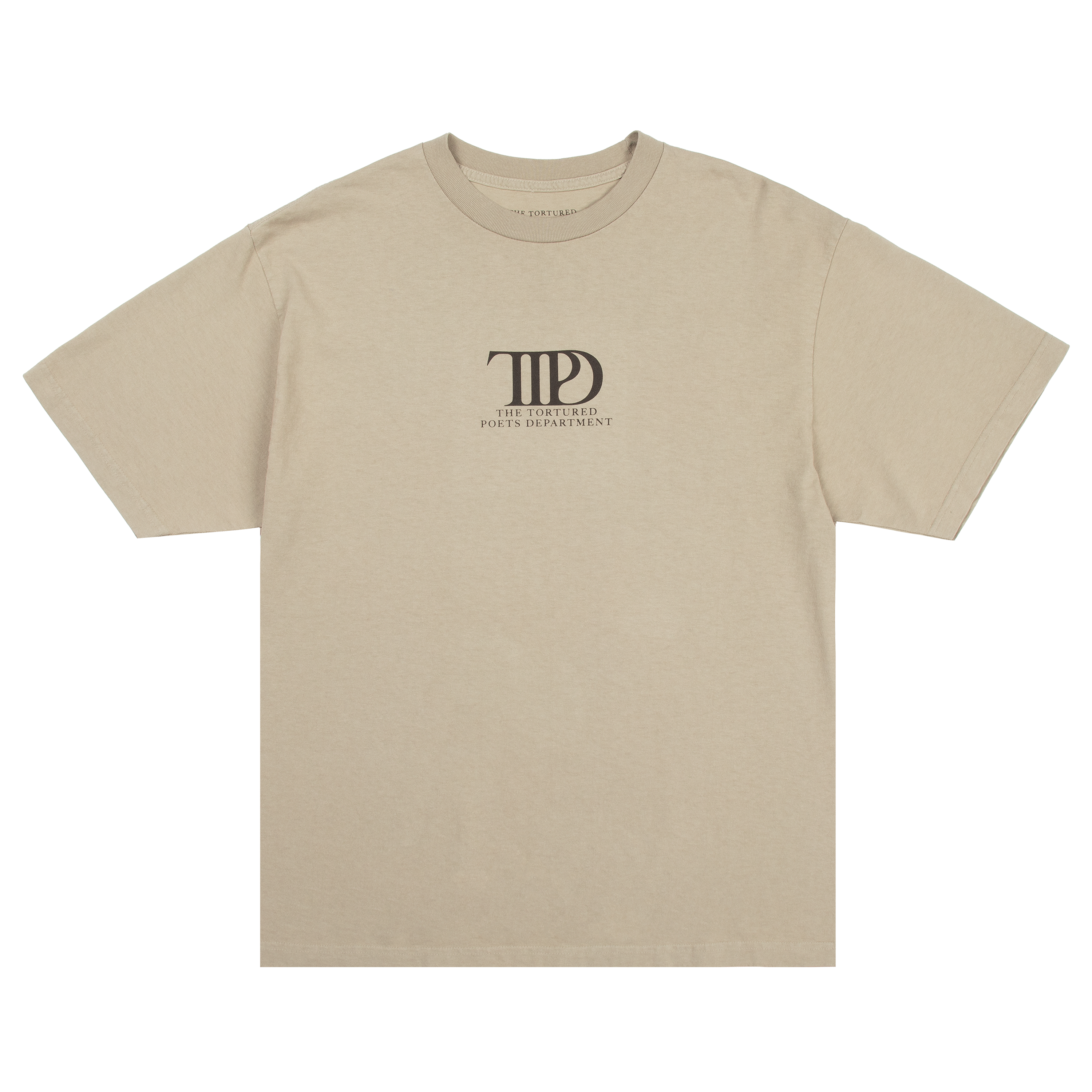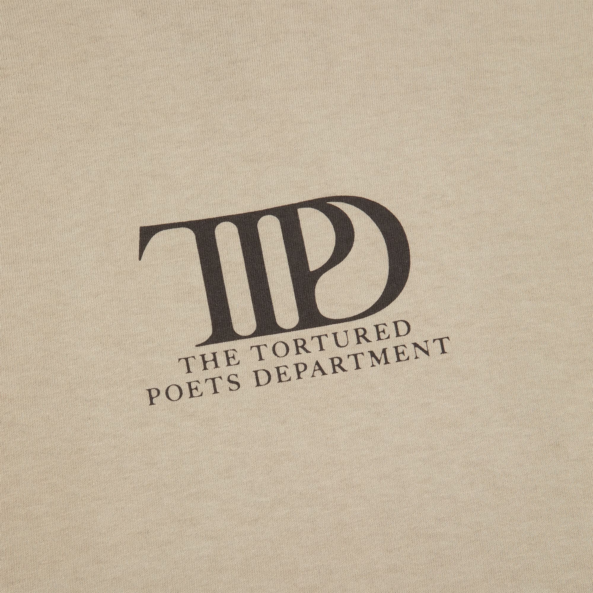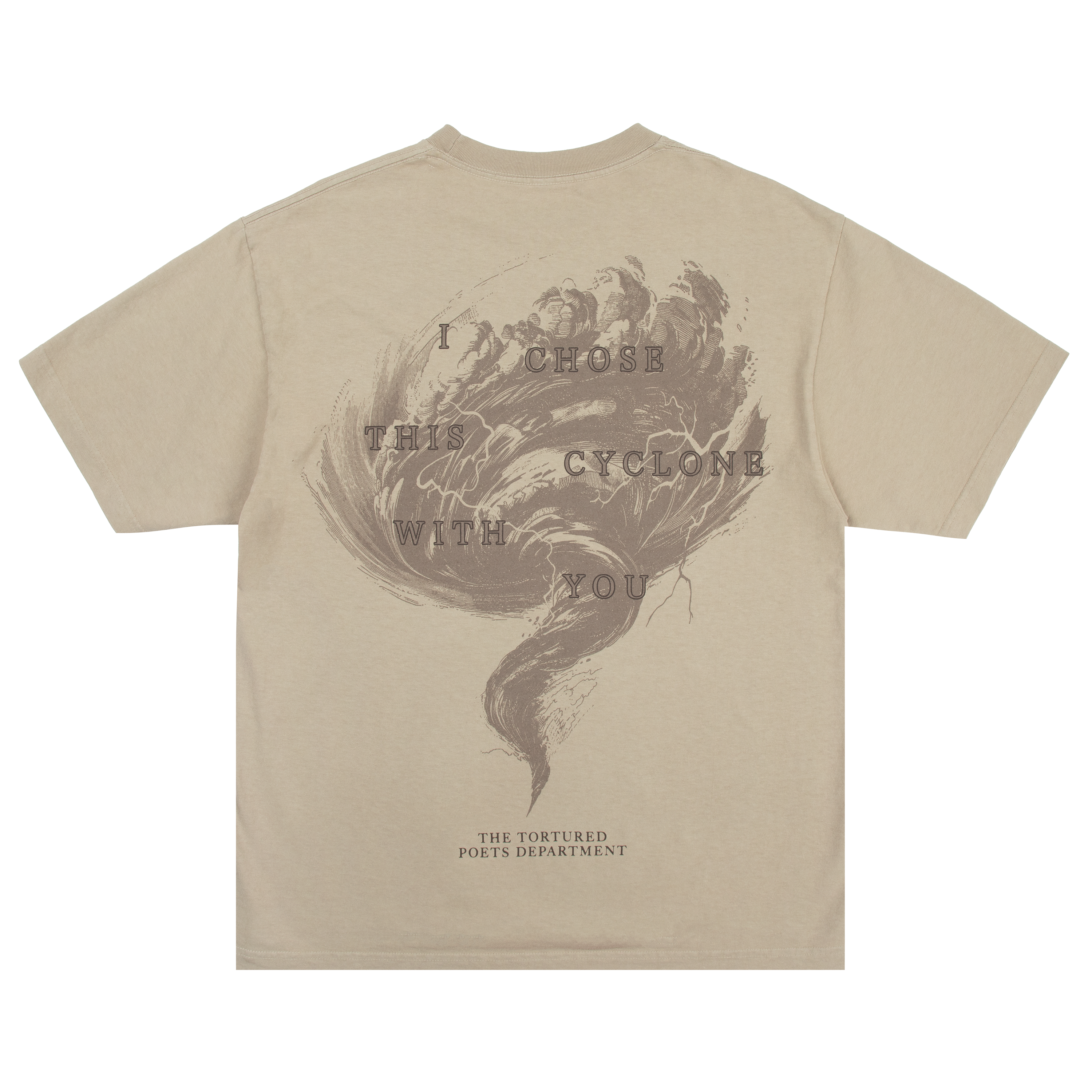 T-shirt taupe avec le "TTPD" album logo et "The Tortured Poets Department" imprimés sur la poitrine du porteur avec un motif de cyclone, les paroles de la chanson "I Chose This Cyclone With You" et "The Tortured Poets Department" imprimés au dos.