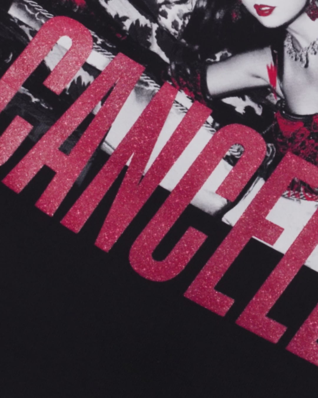 Sweat à capuche noir présentant le logo de l’album “The Life of a Showgirl” en imprimé brillant rouge à l’avant et les paroles de chanson “I Like My Friends Cancelled!” en paillettes rouges avec une photo de Taylor Swift imprimée au dos.