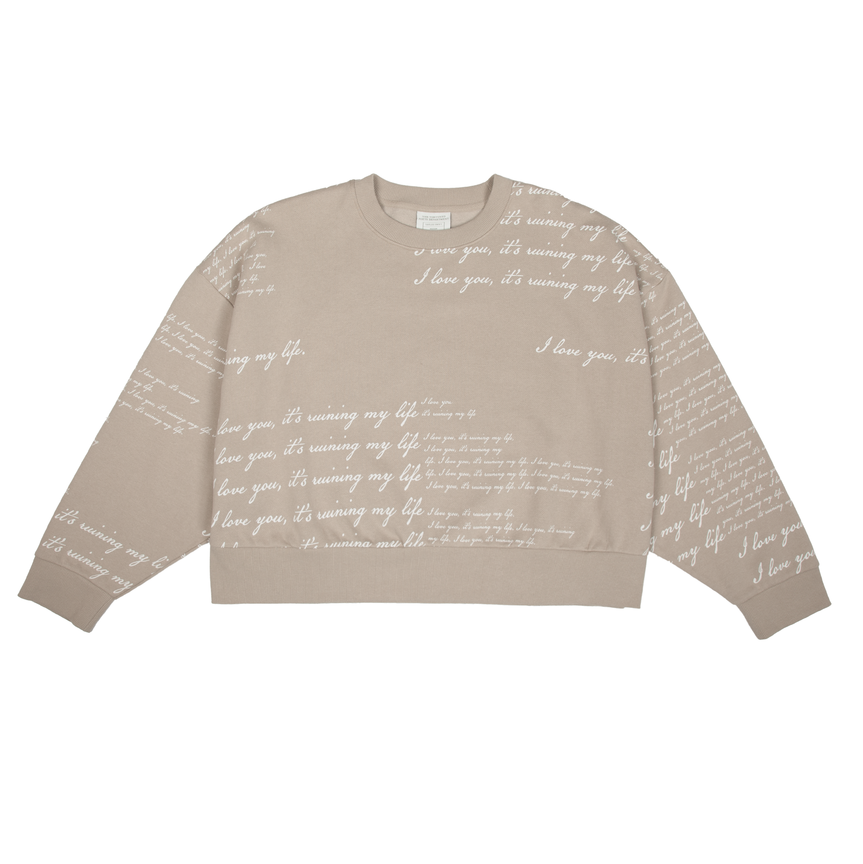 Crewneck beige boxy avec les paroles de la chanson « I Love You, It's Ruining My Life » imprimées sur toute la surface.