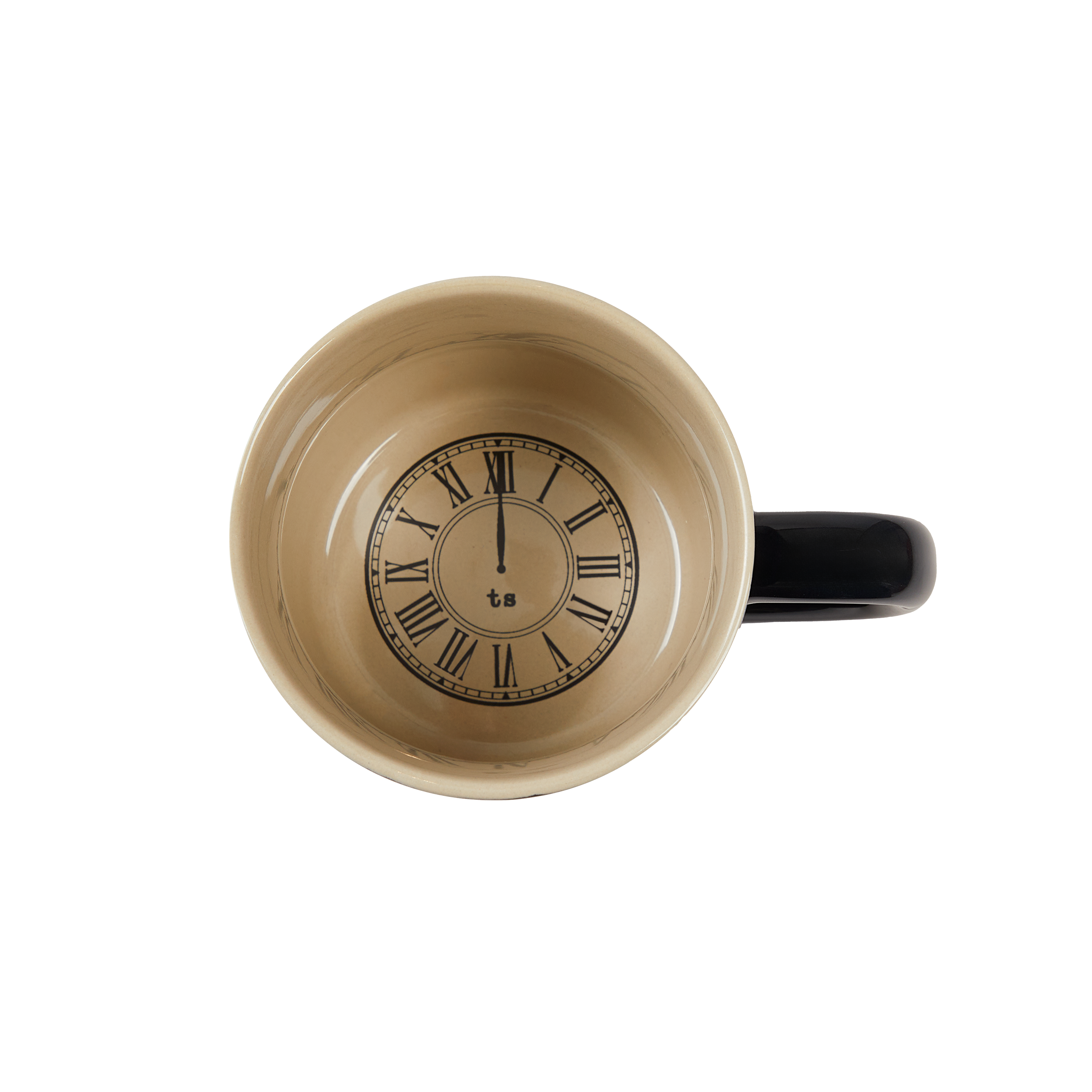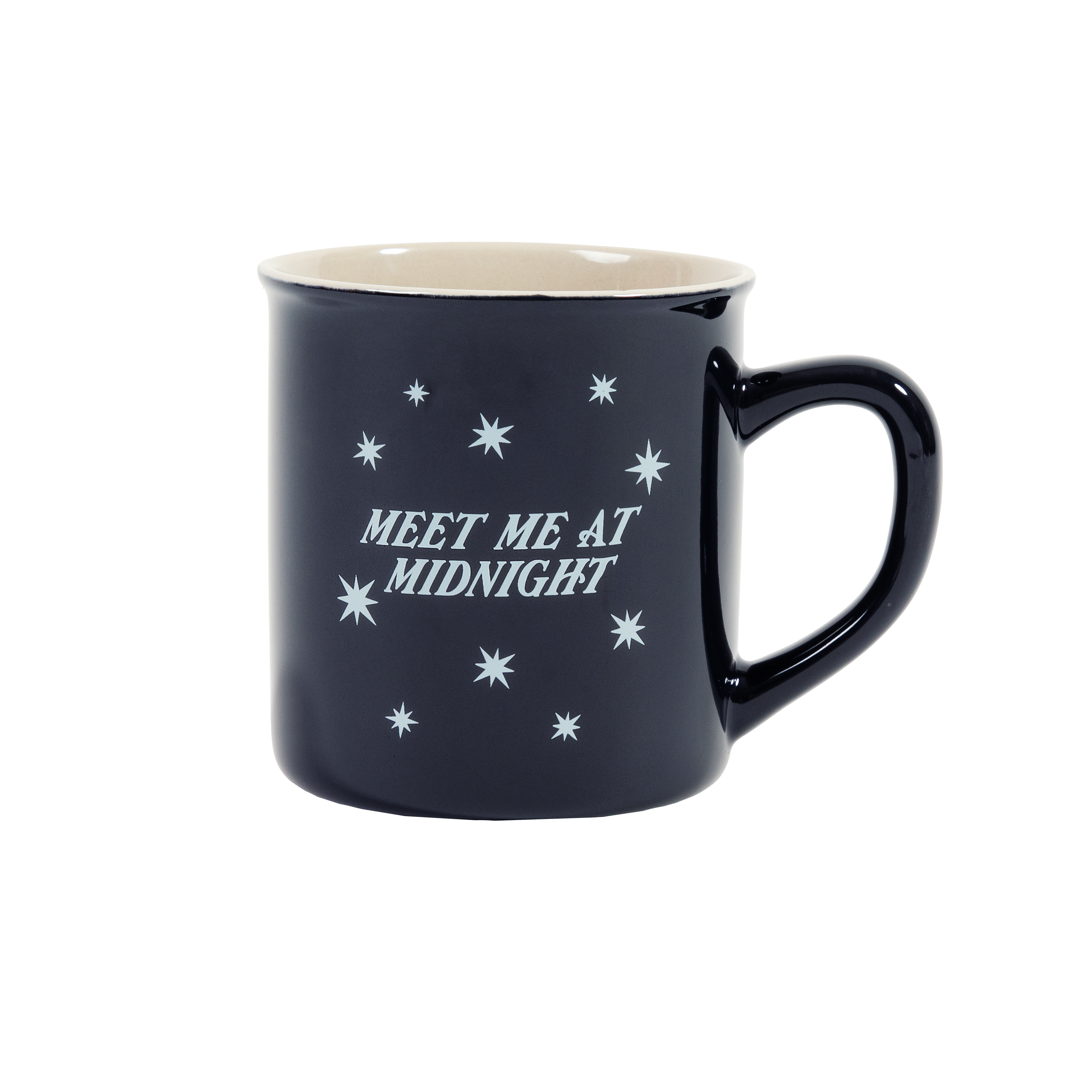 Tasse bleu marine avec paroles de la chanson « Meet me at Midnight » avec un motif d'étoile imprimé sur le devant et un motif d'horloge avec « TS » imprimé à l'intérieur.
