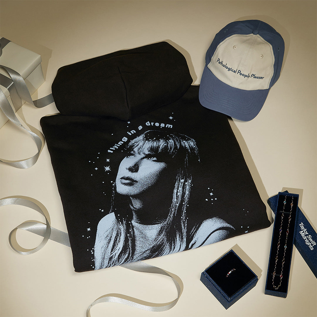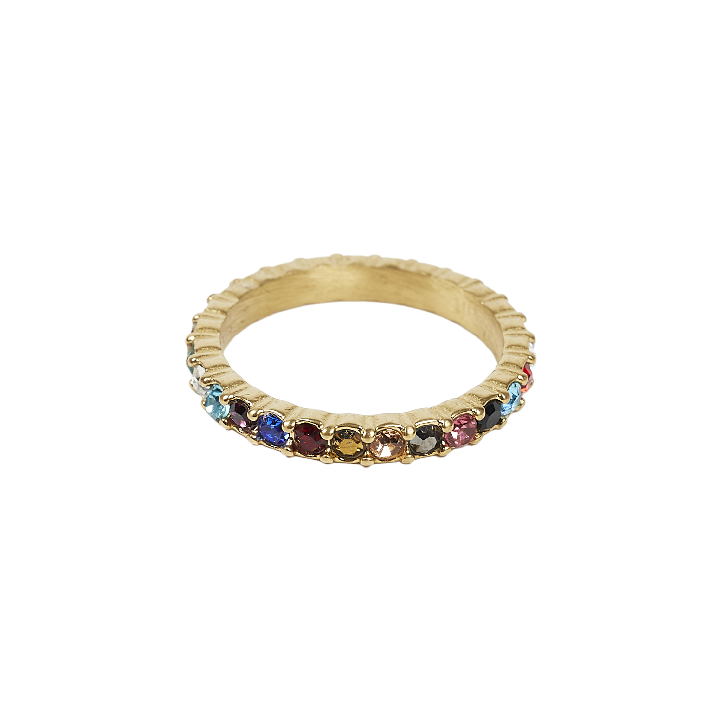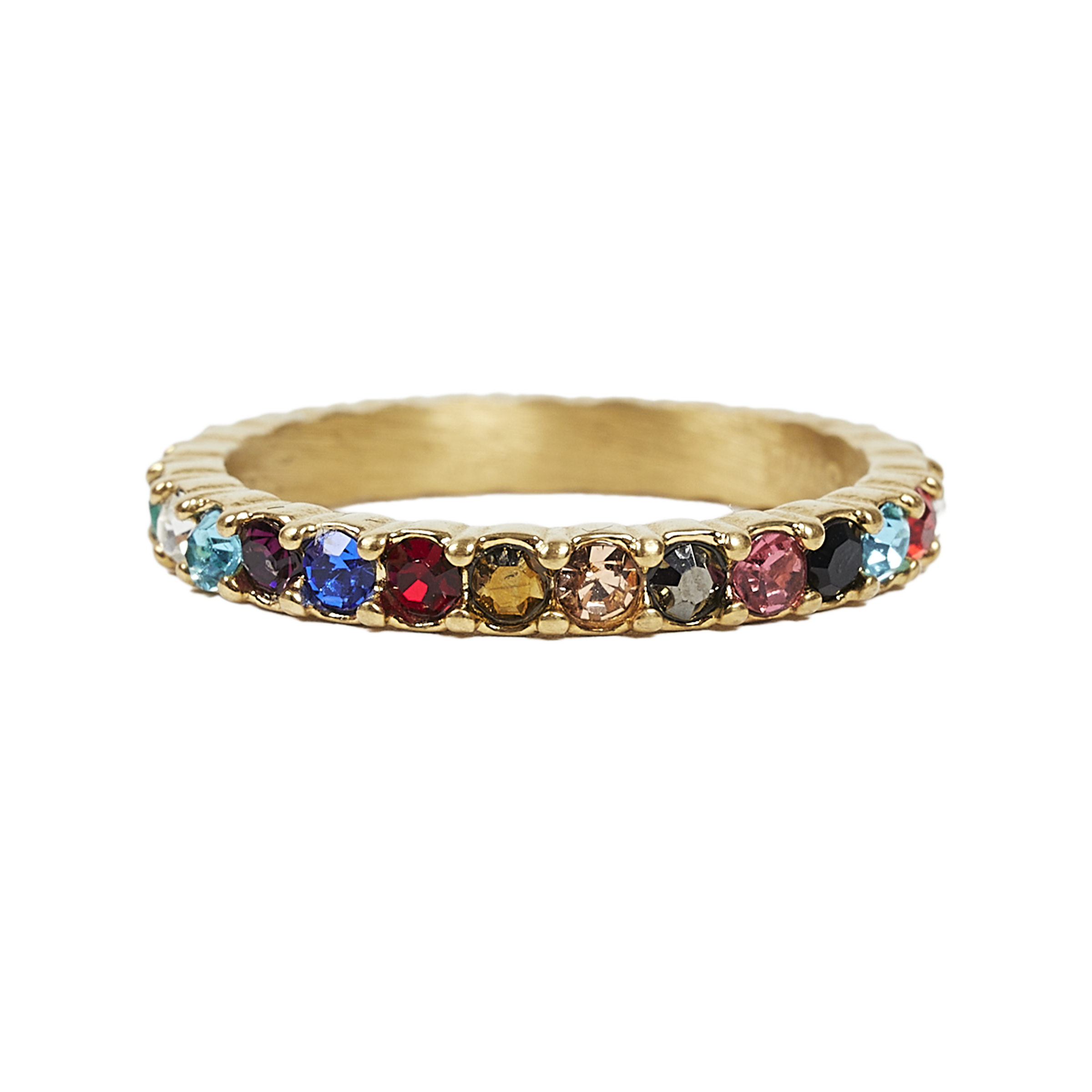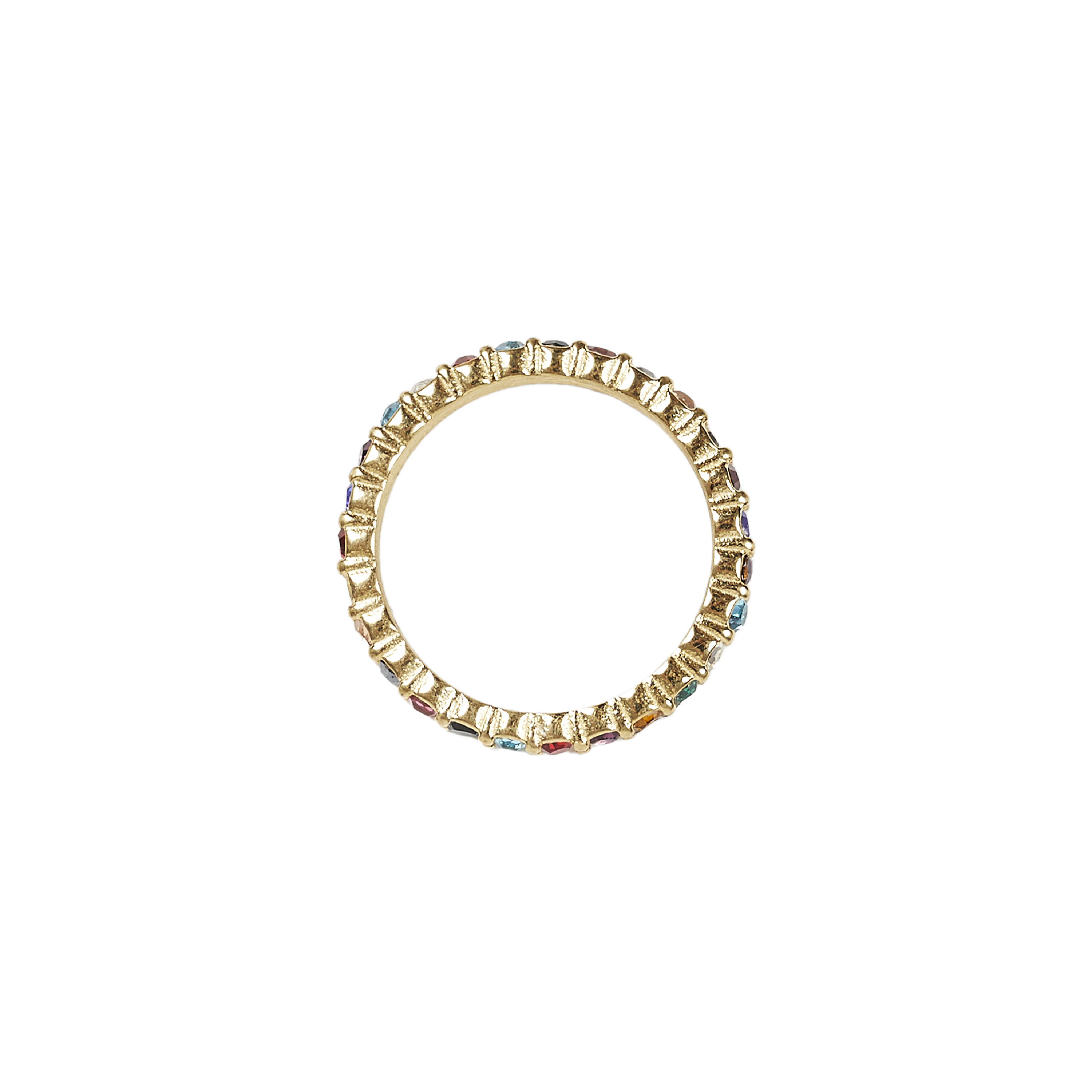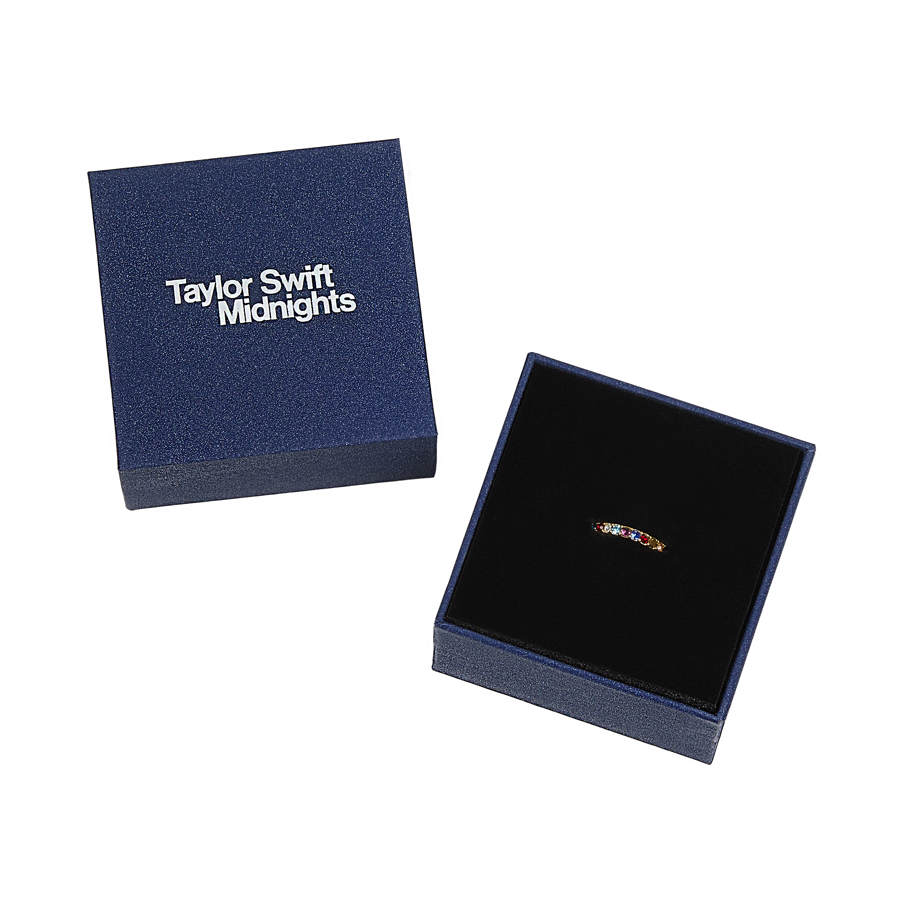 Bague en or avec pierres précieuses multicolores avec "Taylor Swift" gravé à l'intérieur.