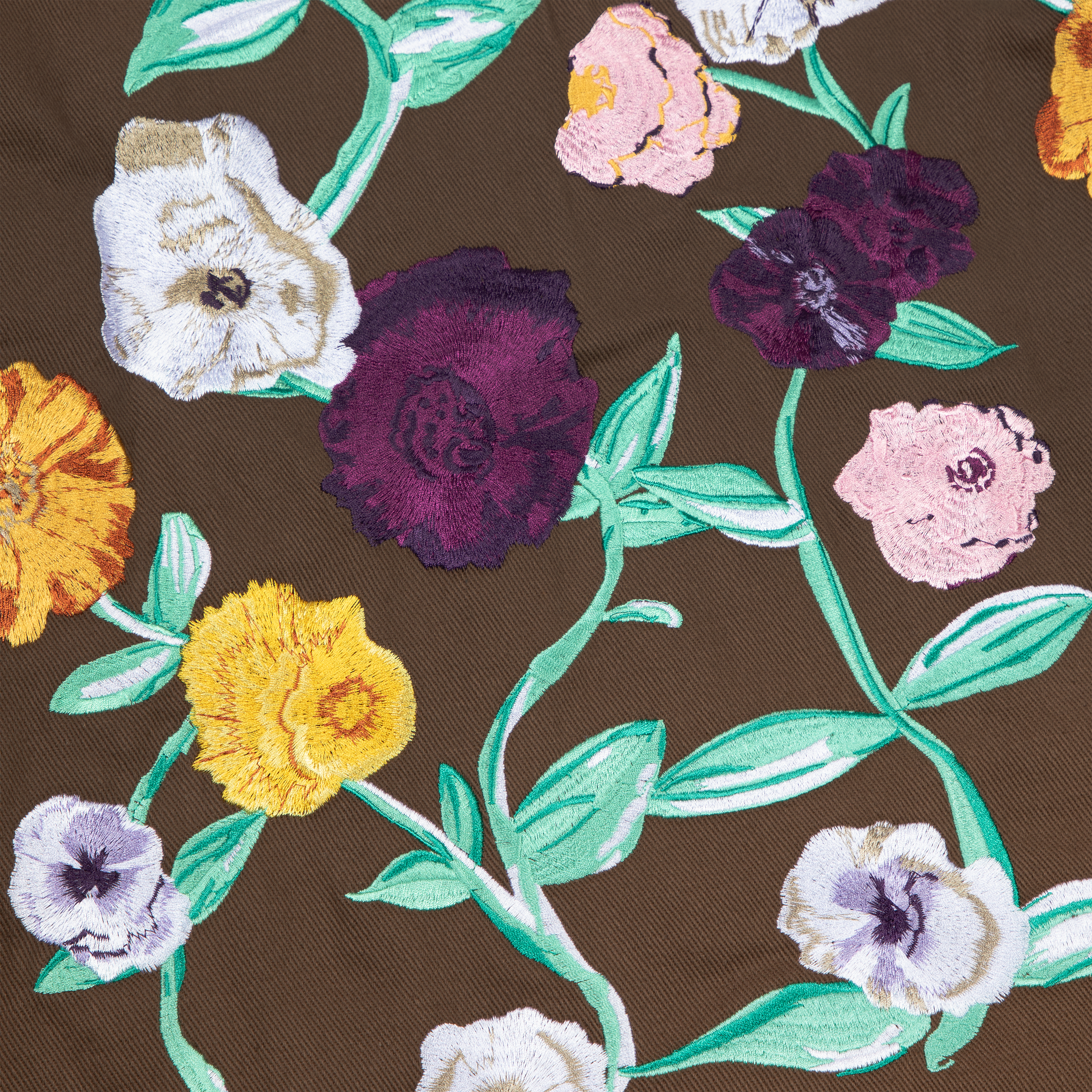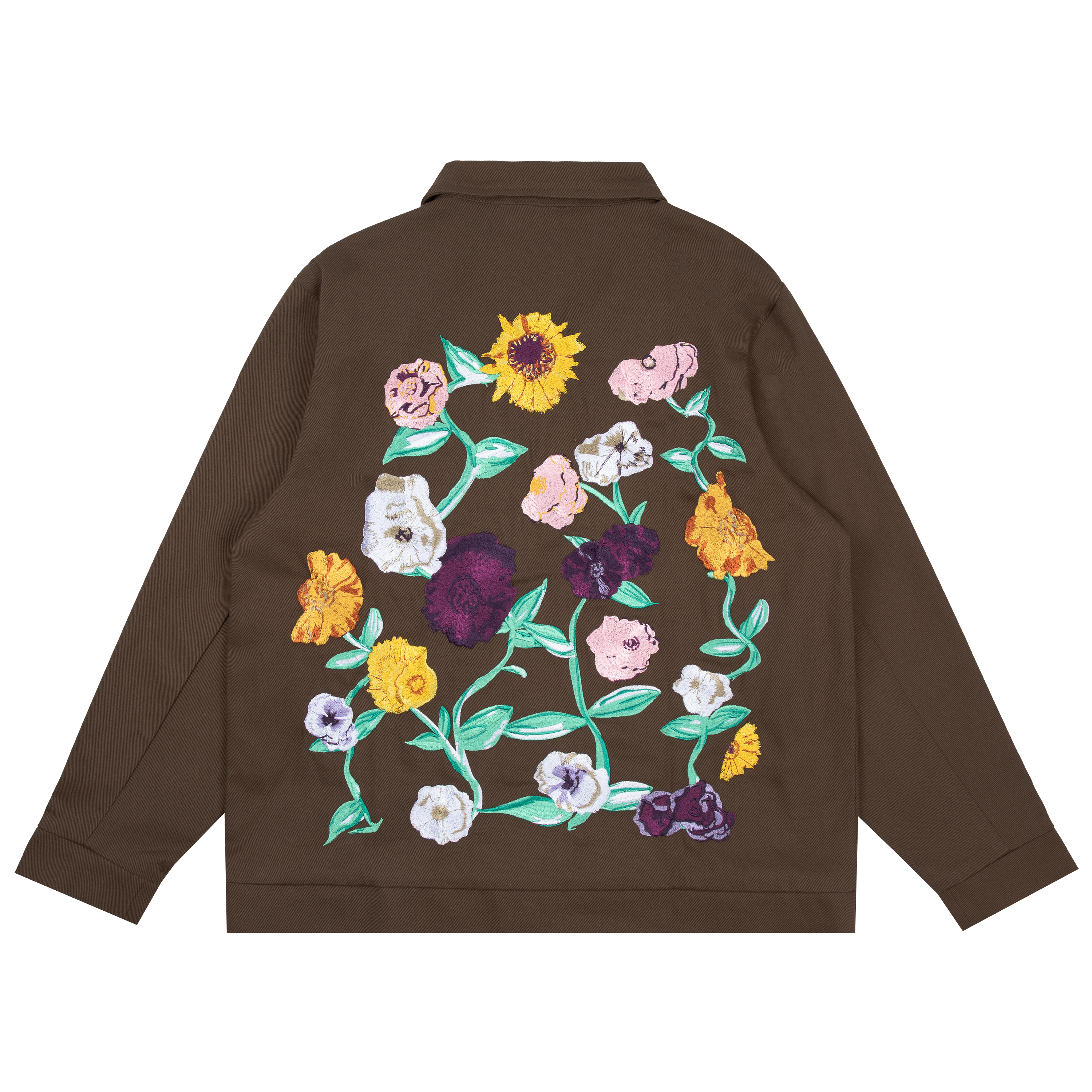 Veste de travail marron zippée sur le devant avec poches latérales avec TS brodé sur la poitrine avant gauche du porteur et motif floral brodé dans le dos.