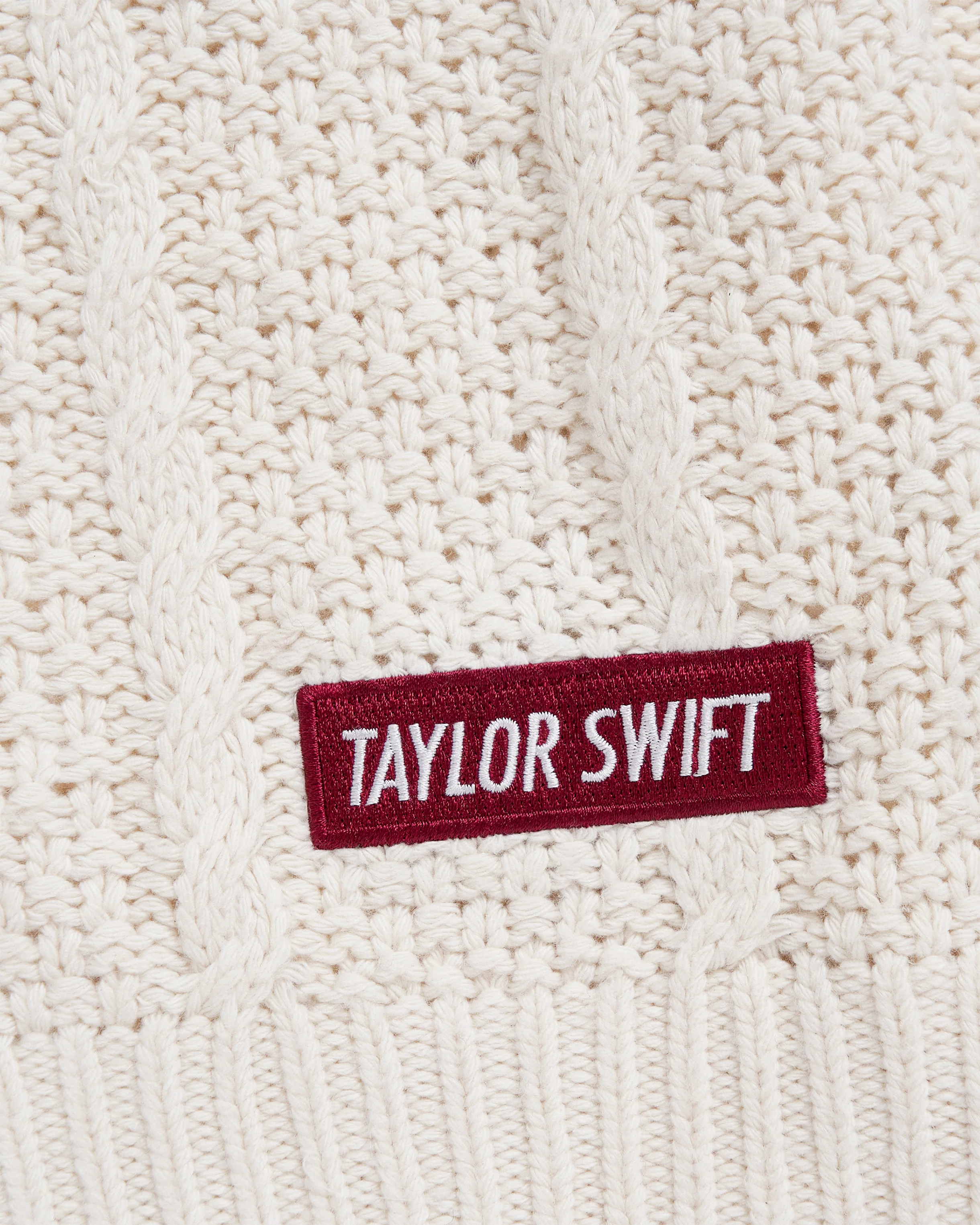 Cardigan crème à trois boutons en maille torsadée, orné de quatre étoiles rouge foncé brodées sur chaque manche et d'un écusson rouge foncé « Taylor Swift » en bas à gauche.
