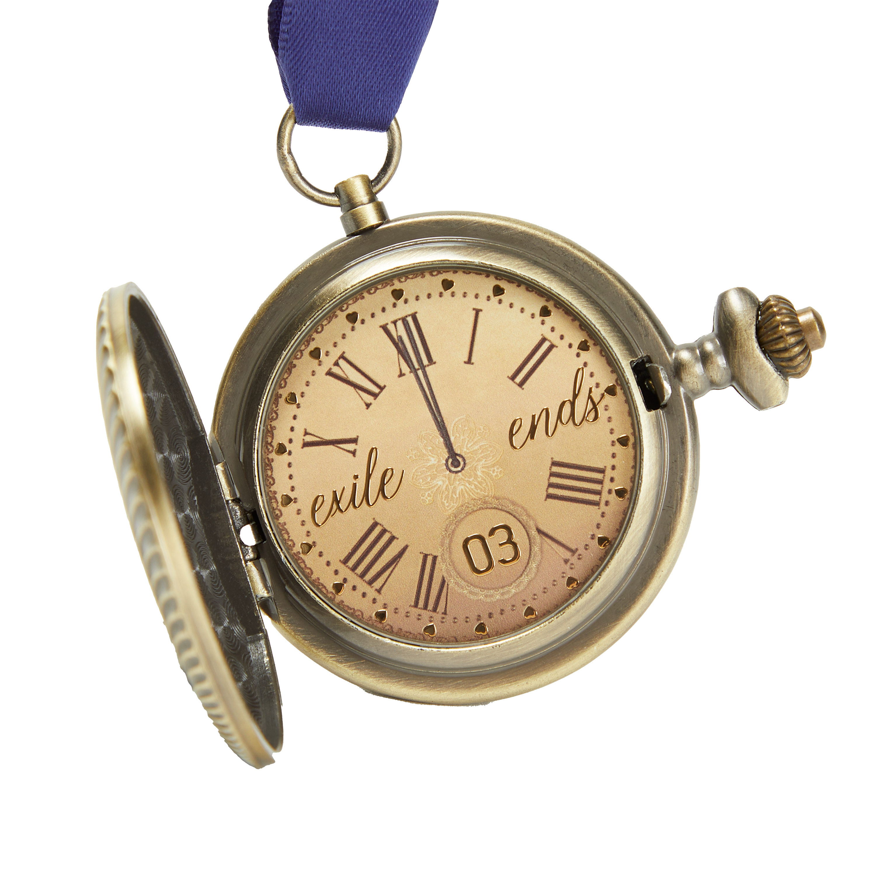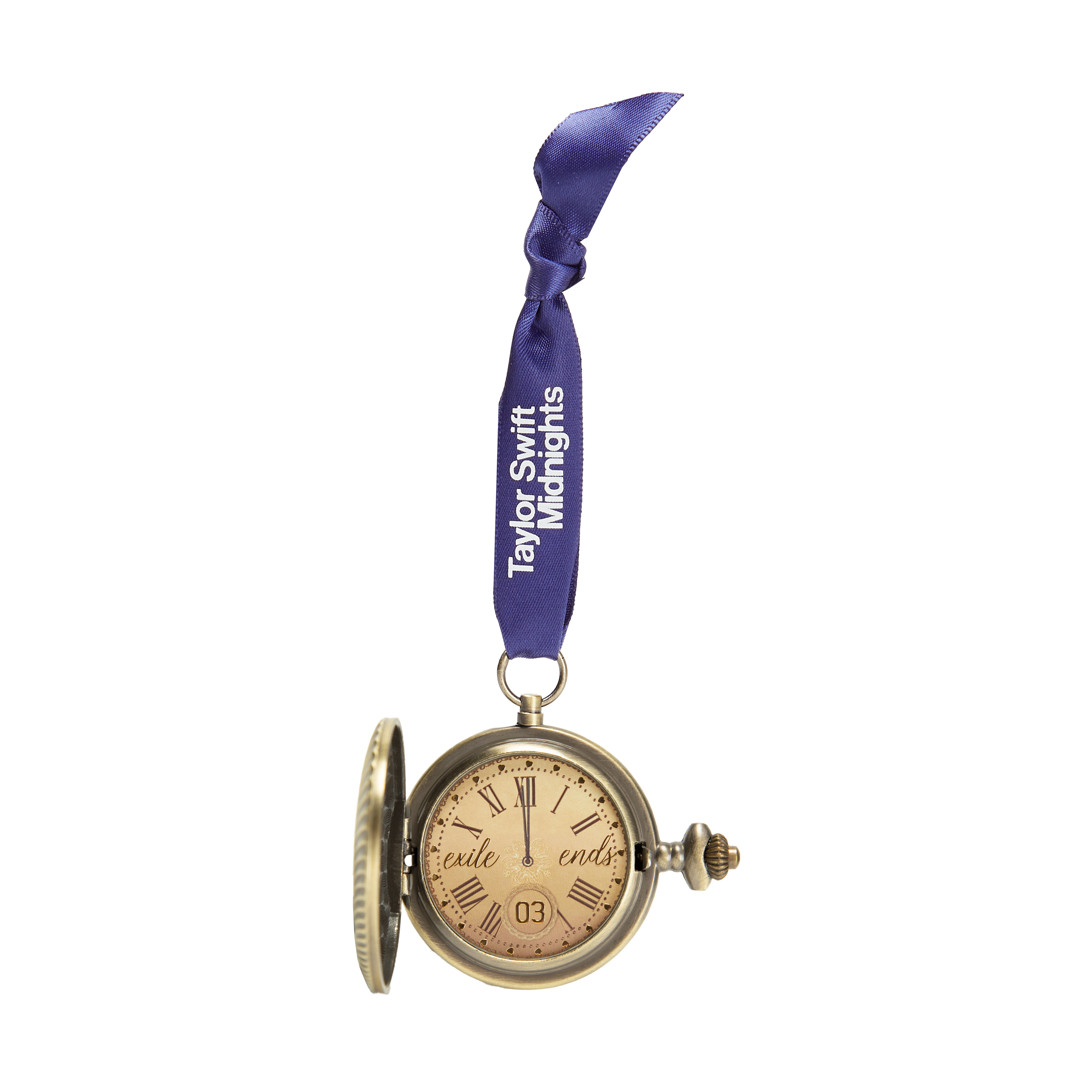 Ornement de montre de poche avec les paroles de la chanson "Exile Ends" sur le devant et "Taylor Swift Midnights" imprimé sur un ruban bleu nuit.