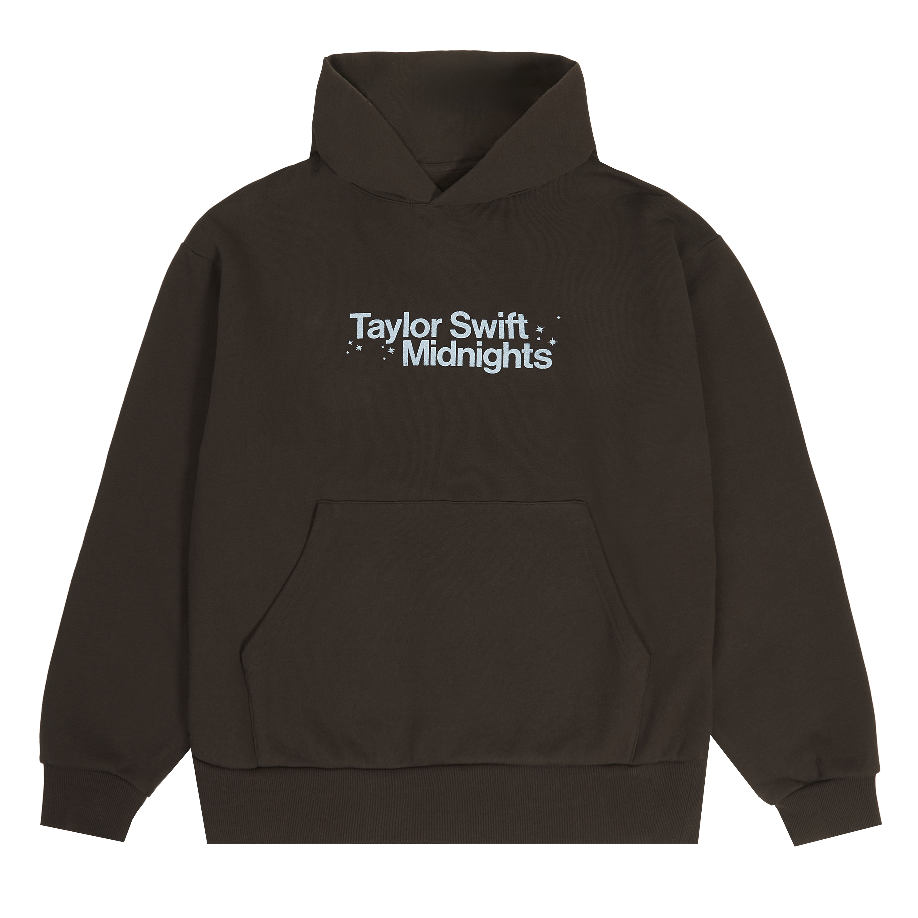 Sweat à capuche marron avec poche avant avec le titre de l'album "Taylor Swift Midnights" avec un motif d'étoile imprimé sur le devant avec une photo de Taylor Swift et les paroles de la chanson "flying in a dream, stars by the pocketful" avec un motif d'étoile imprimé au dos.