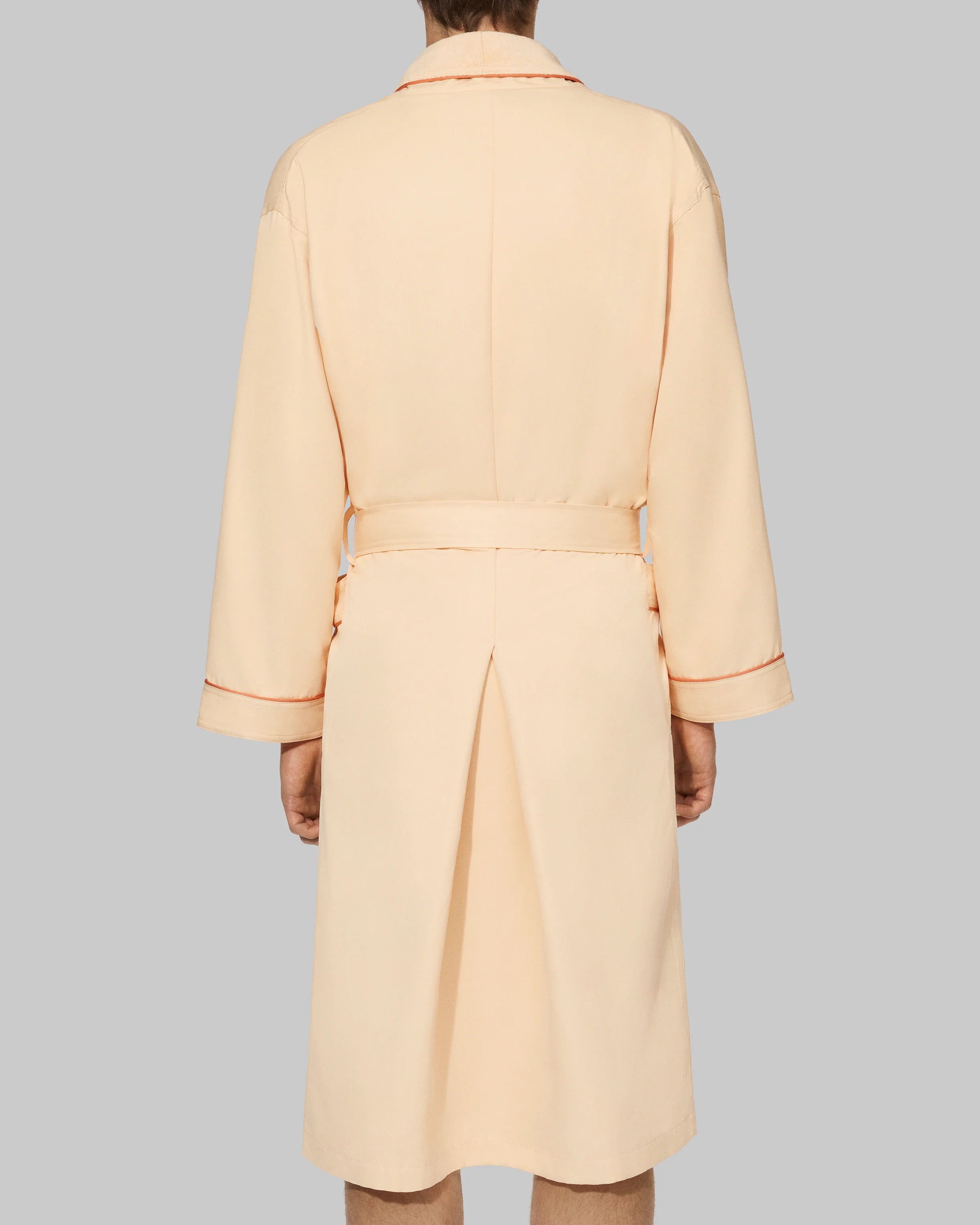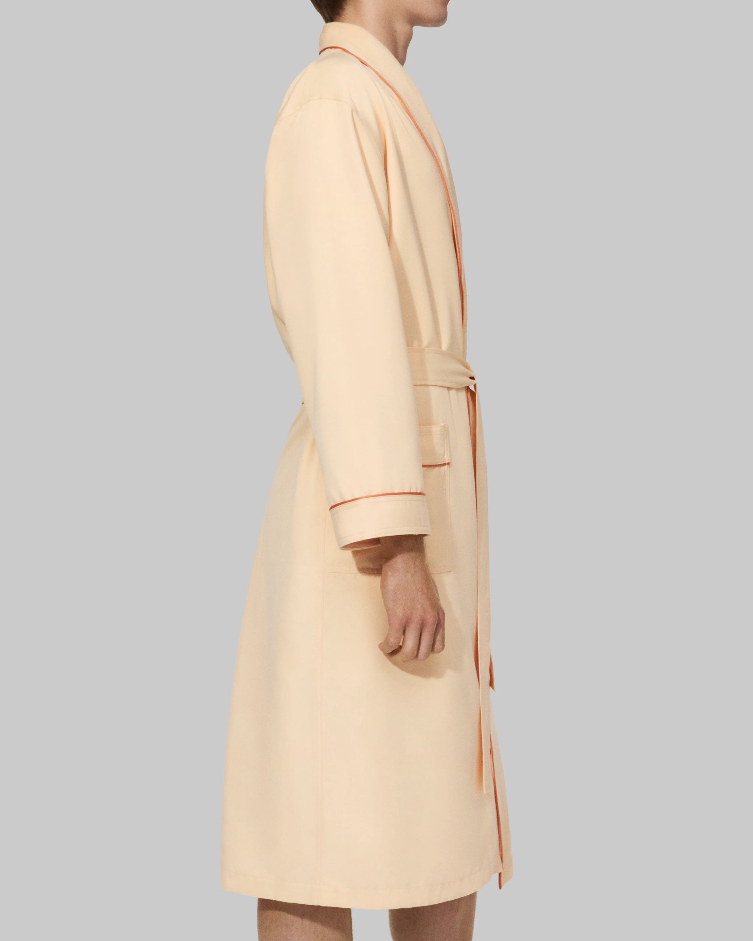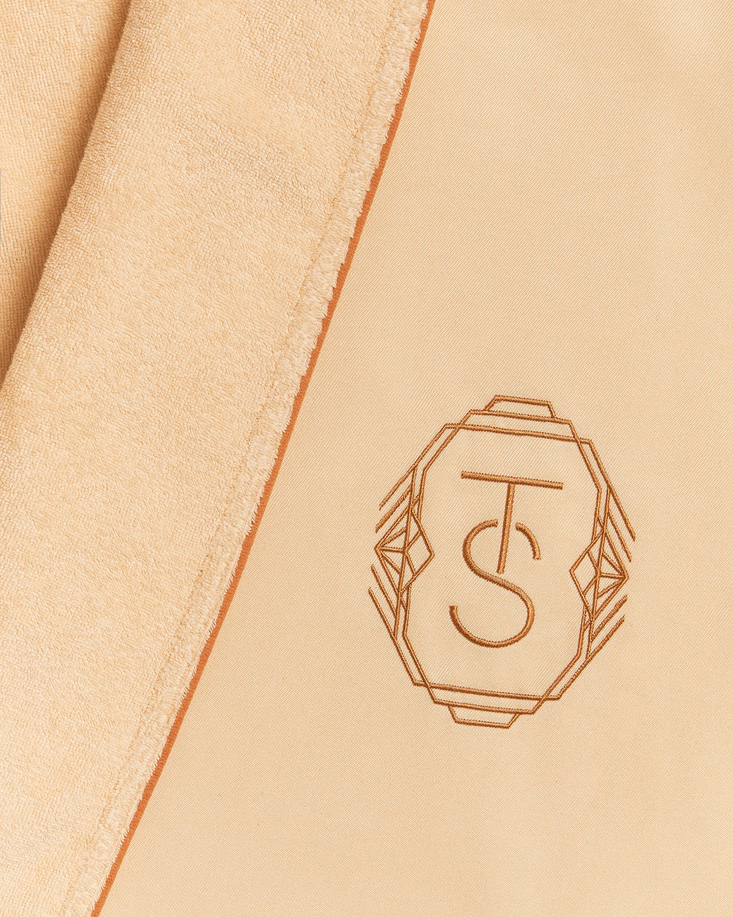 Peignoir orange clair avec ceinture, doublure en éponge, passepoil contrasté orange brûlé, 2 poches et logo " TS " brodé sur la poitrine gauche.