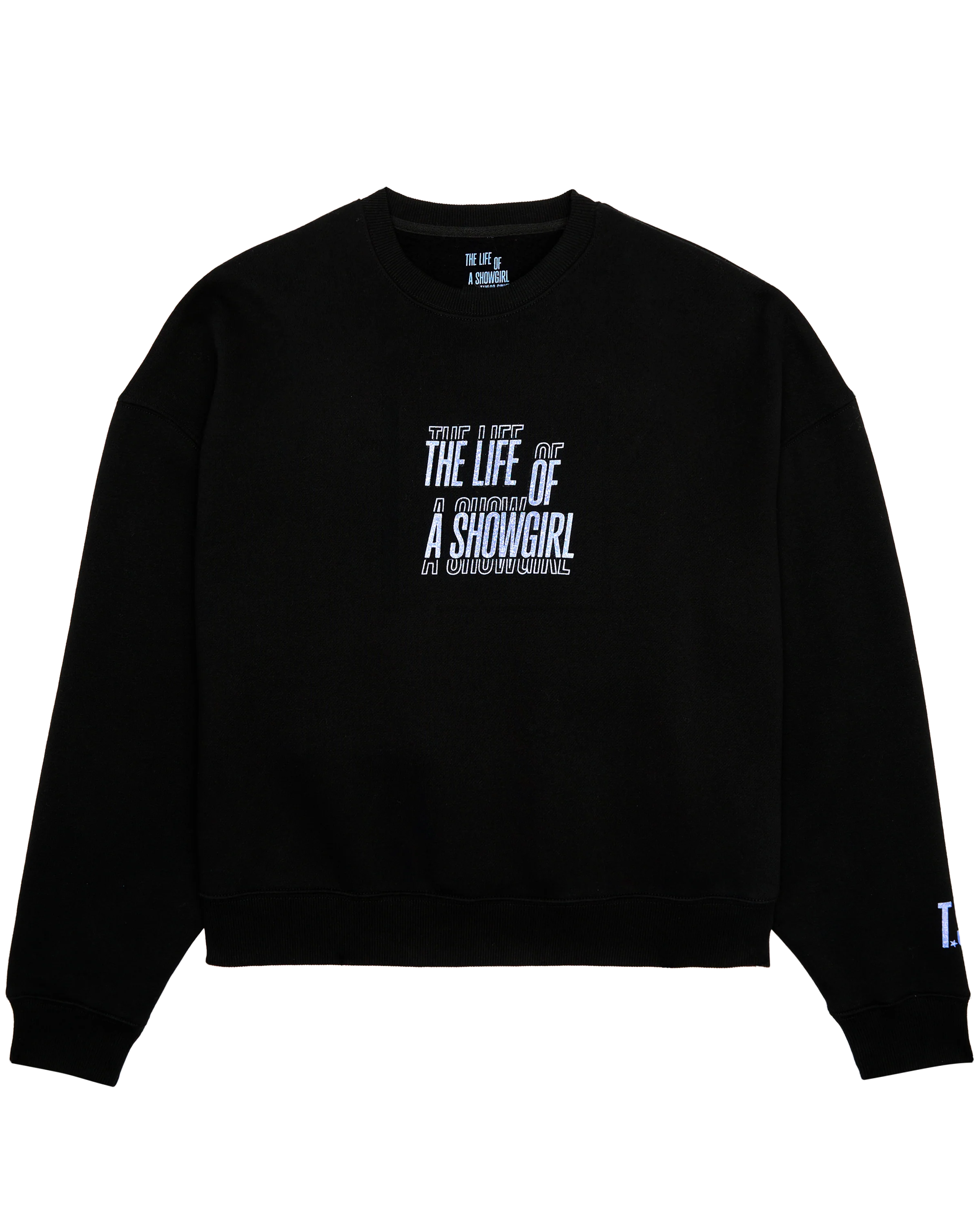 Sweat-shirt noir à manches longues à col rond présentant le logo de l’album “The Life of a Showgirl” en imprimé brillant violet à l’avant et le même logo accompagné de photos de Taylor Swift imprimé au dos.