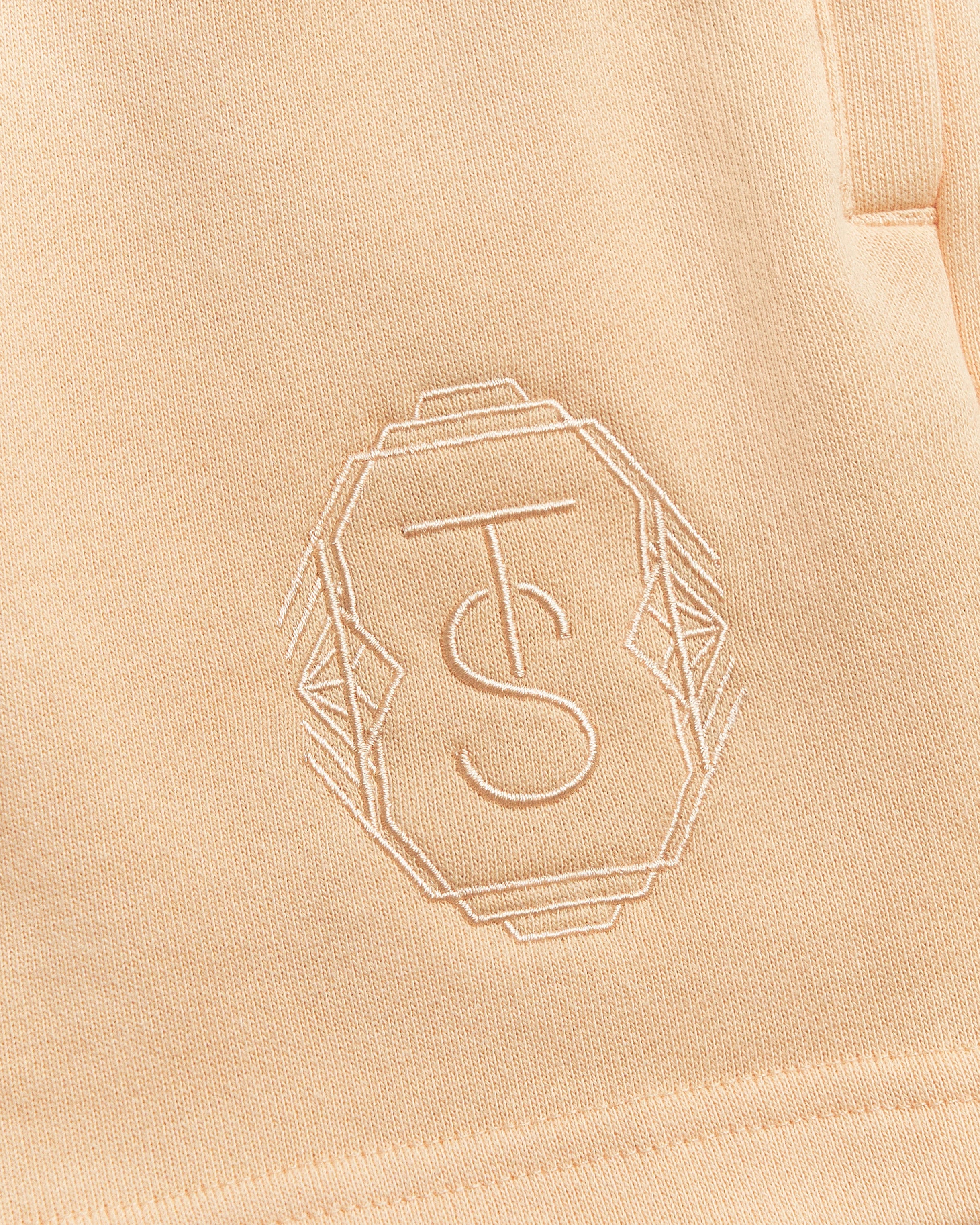 Short de survêtement orange clair avec poches latérales et logo " TS " brodé sur la jambe gauche à l'avant.