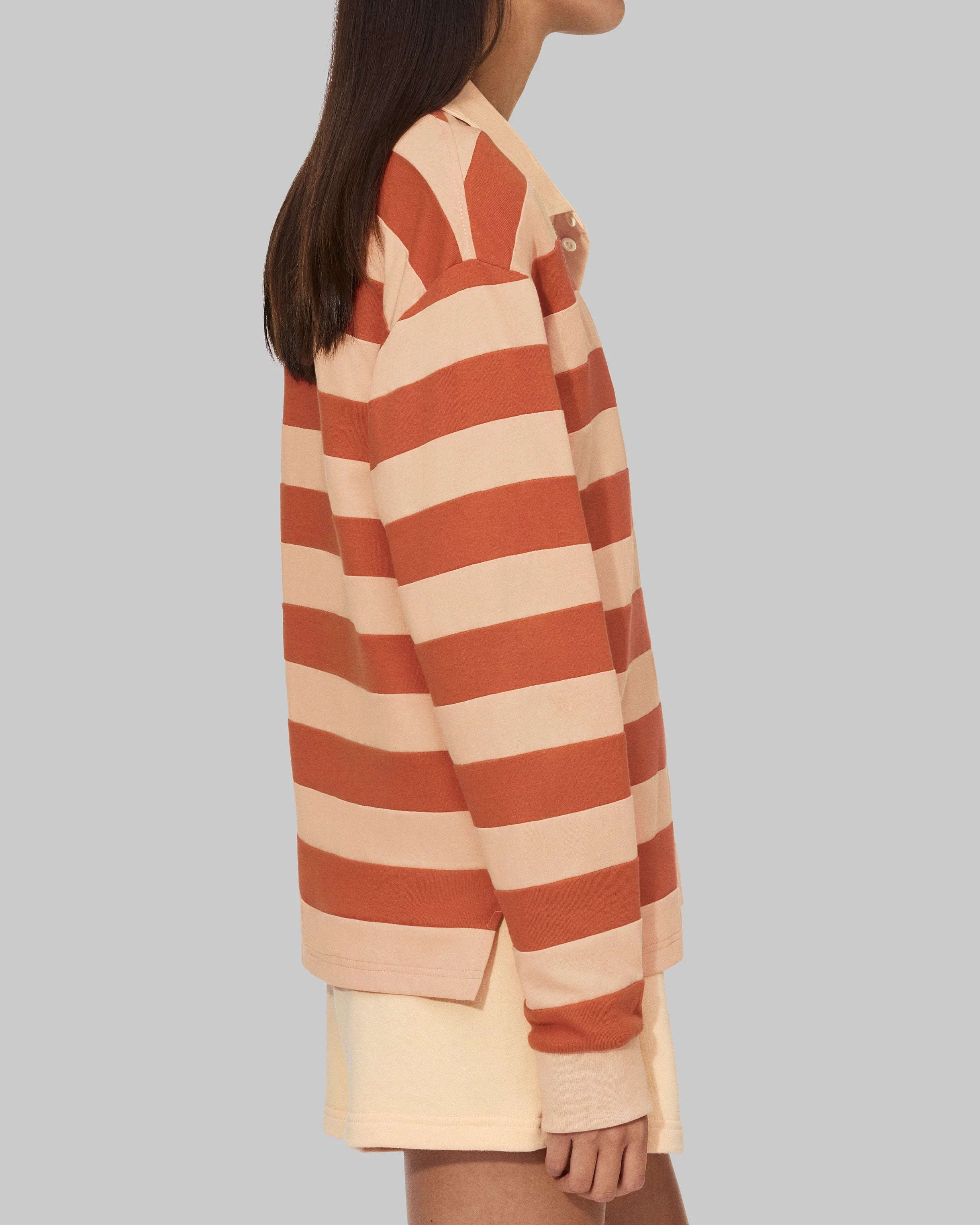 Chemise de rugby à manches longues, col et rayures oranges, avec trois boutons et logo " TS " brodé sur la poitrine gauche.