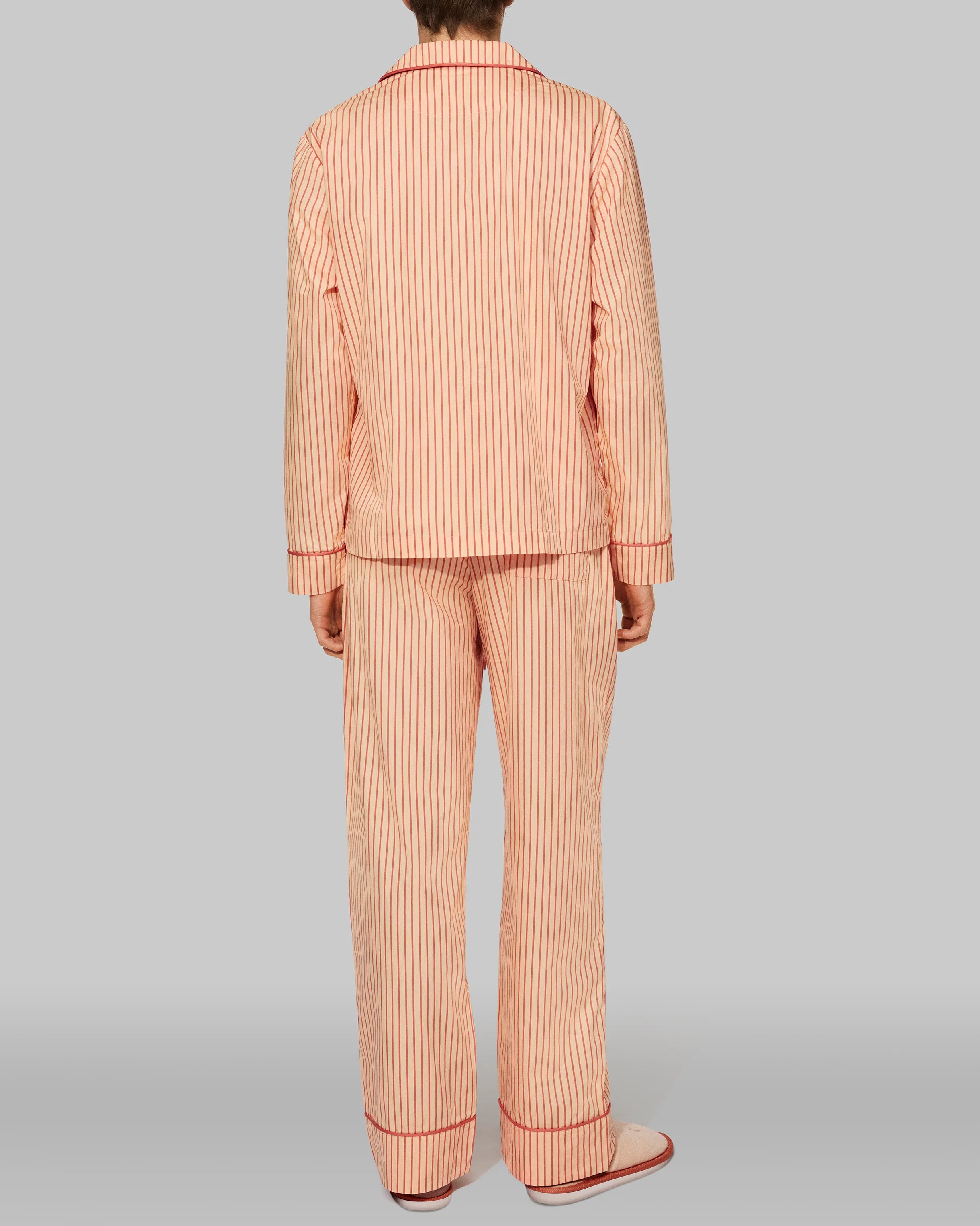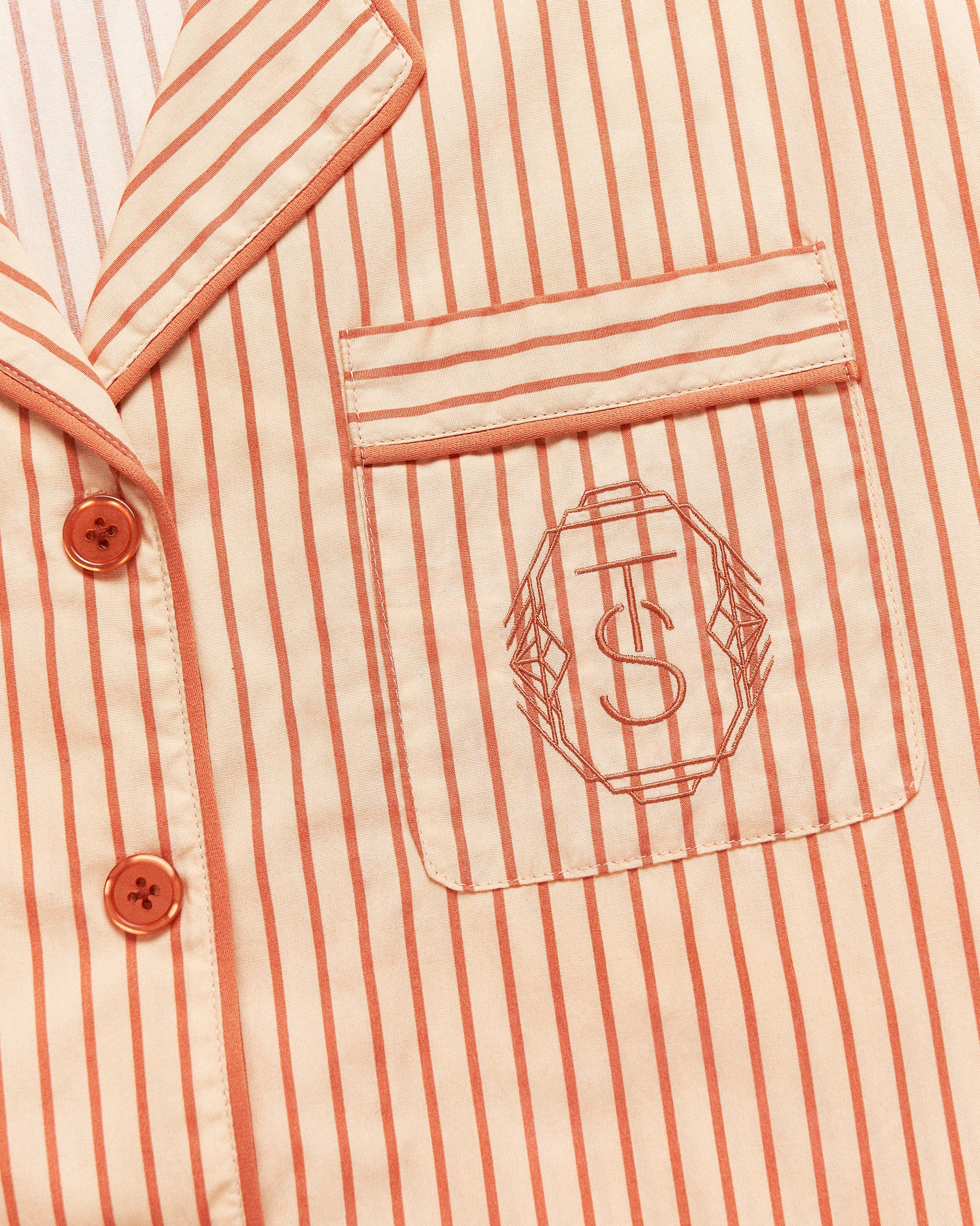 Haut à manches longues boutonné à rayures oranges avec coutures contrastées orange brûlé et poche sur la poitrine gauche avec logo " TS " brodé sur la poche. Pantalon à rayures oranges avec cordon de serrage, poches latérales avec coutures orange brûlé, braguette non fonctionnelle à 3 boutons et logo " TS " brodé sur la jambe gauche à l'avant.