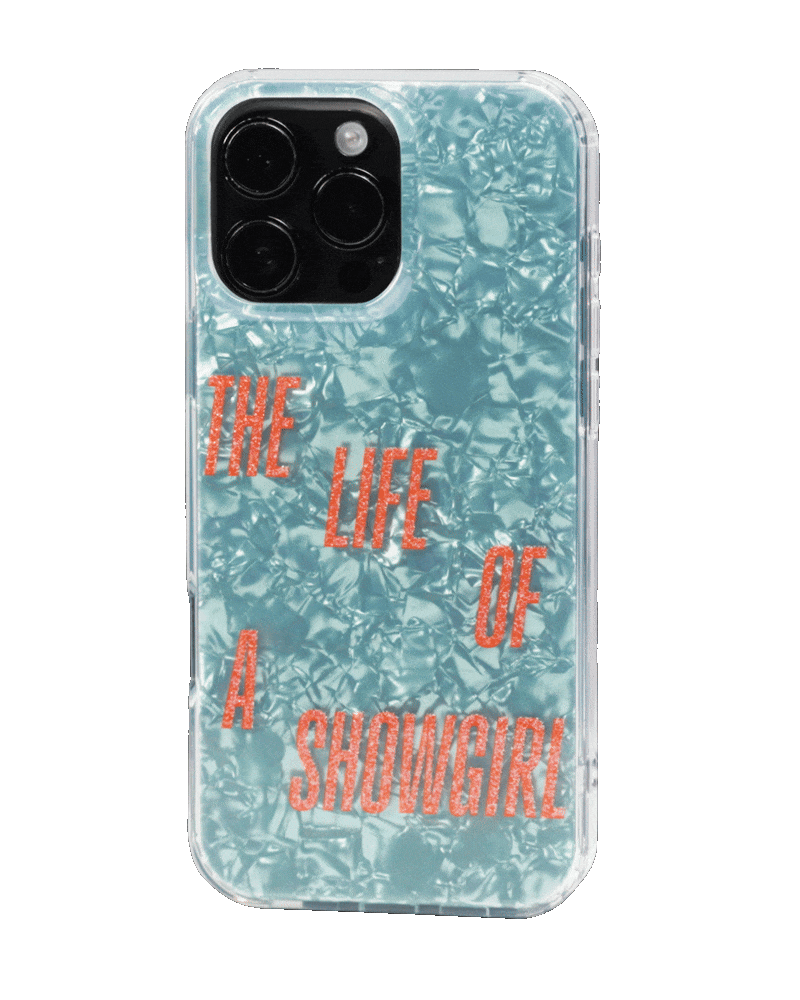 Coque de téléphone vert menthe nacrée pailletée présentant le logo de l’album “The Life of a Showgirl” imprimé brillant orange sur la coque.