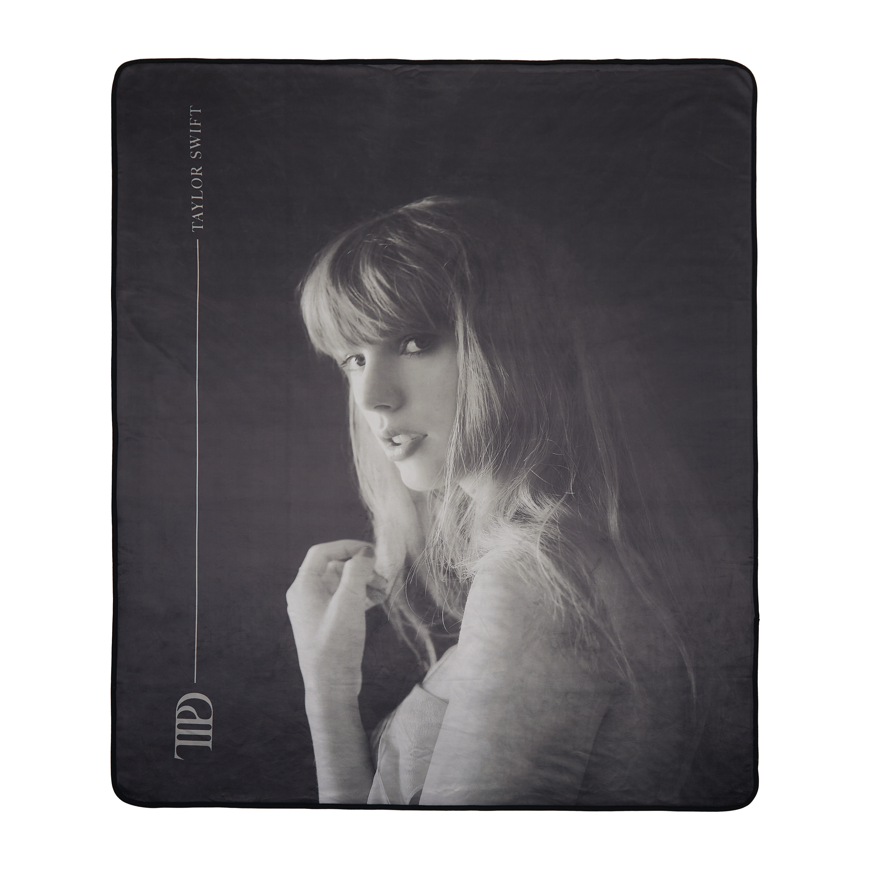 Couverture polaire gris foncé avec photo de Taylor Swift avec « TTPD » et « Taylor Swift » avec un motif de ligne imprimé sur le devant.