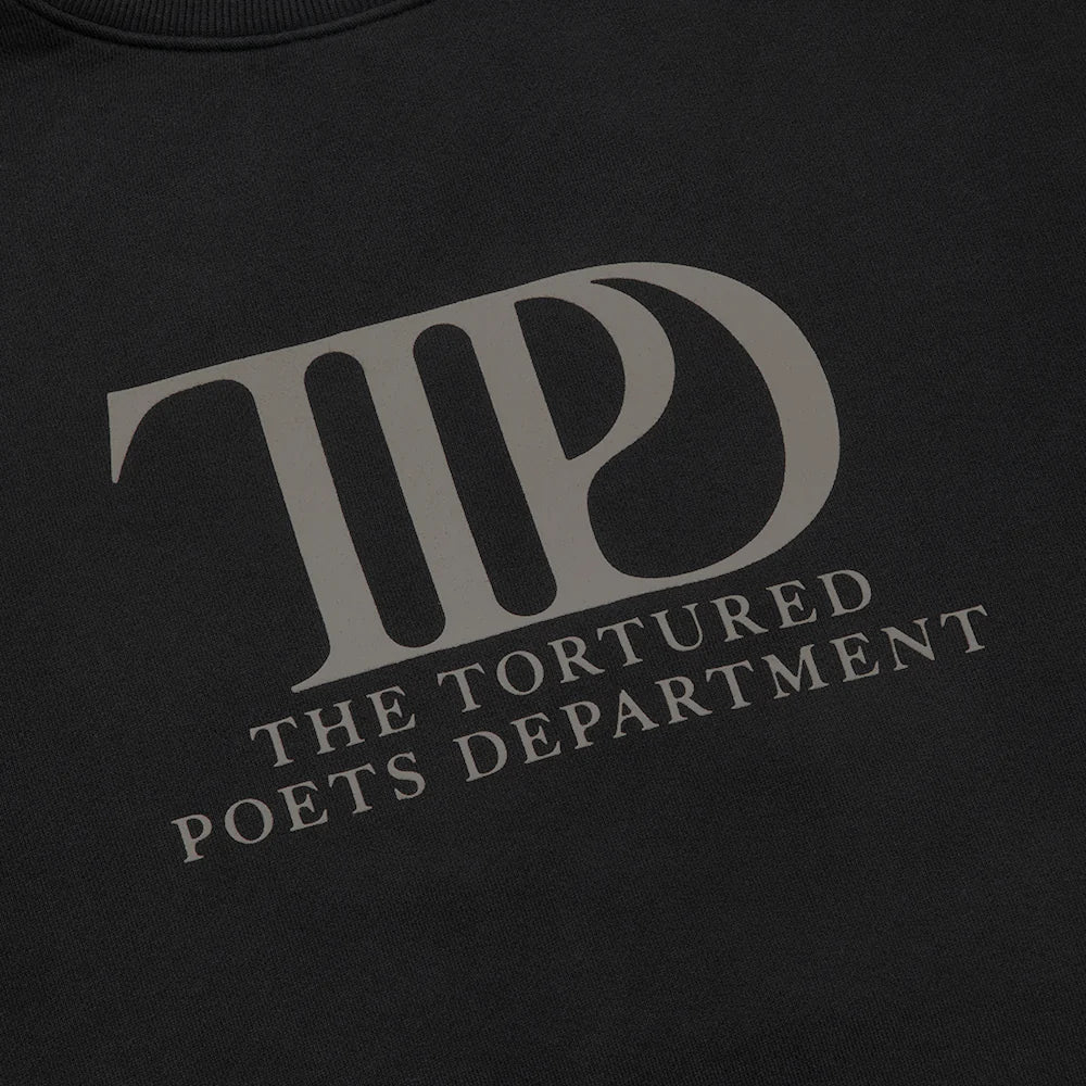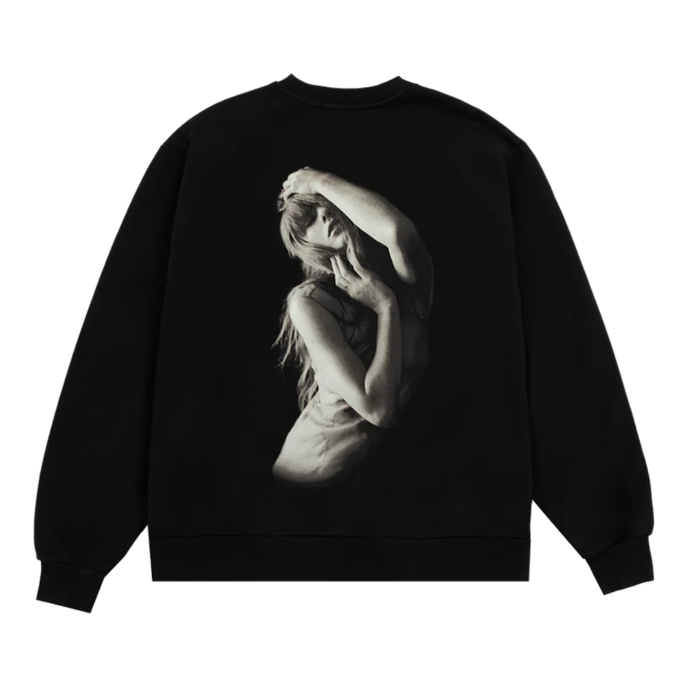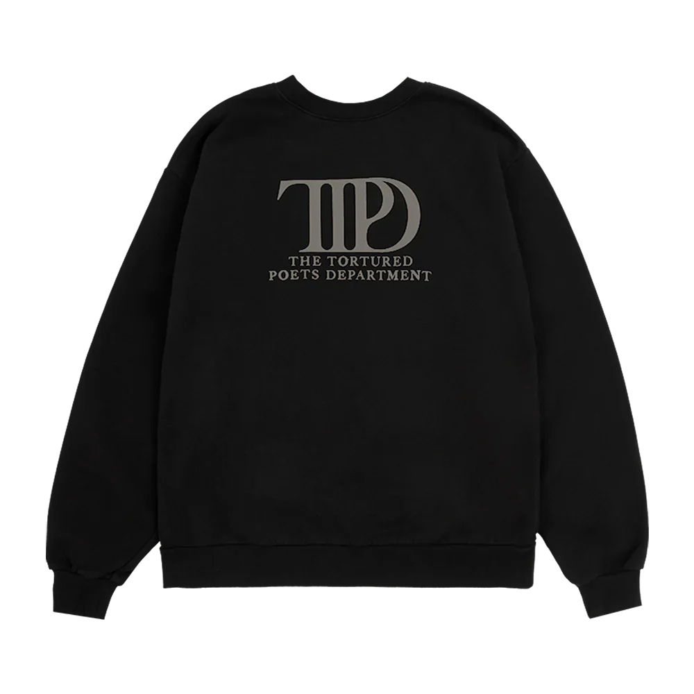 Crewneck noir avec imprimé gris du logo de l'album "TTPD" et "The Tortured Poets Department" sur le devant, et photo de Taylor Swift sur le dos.