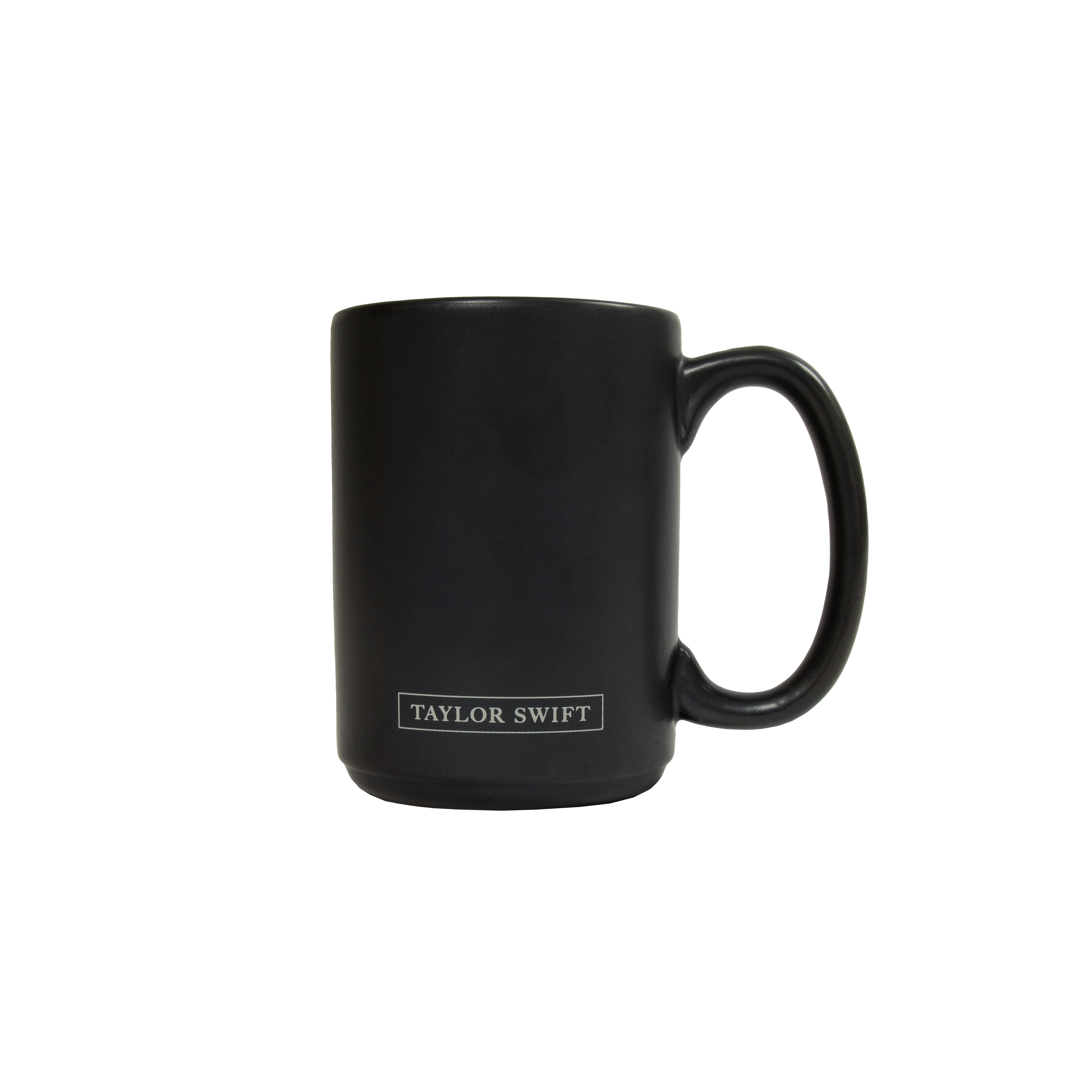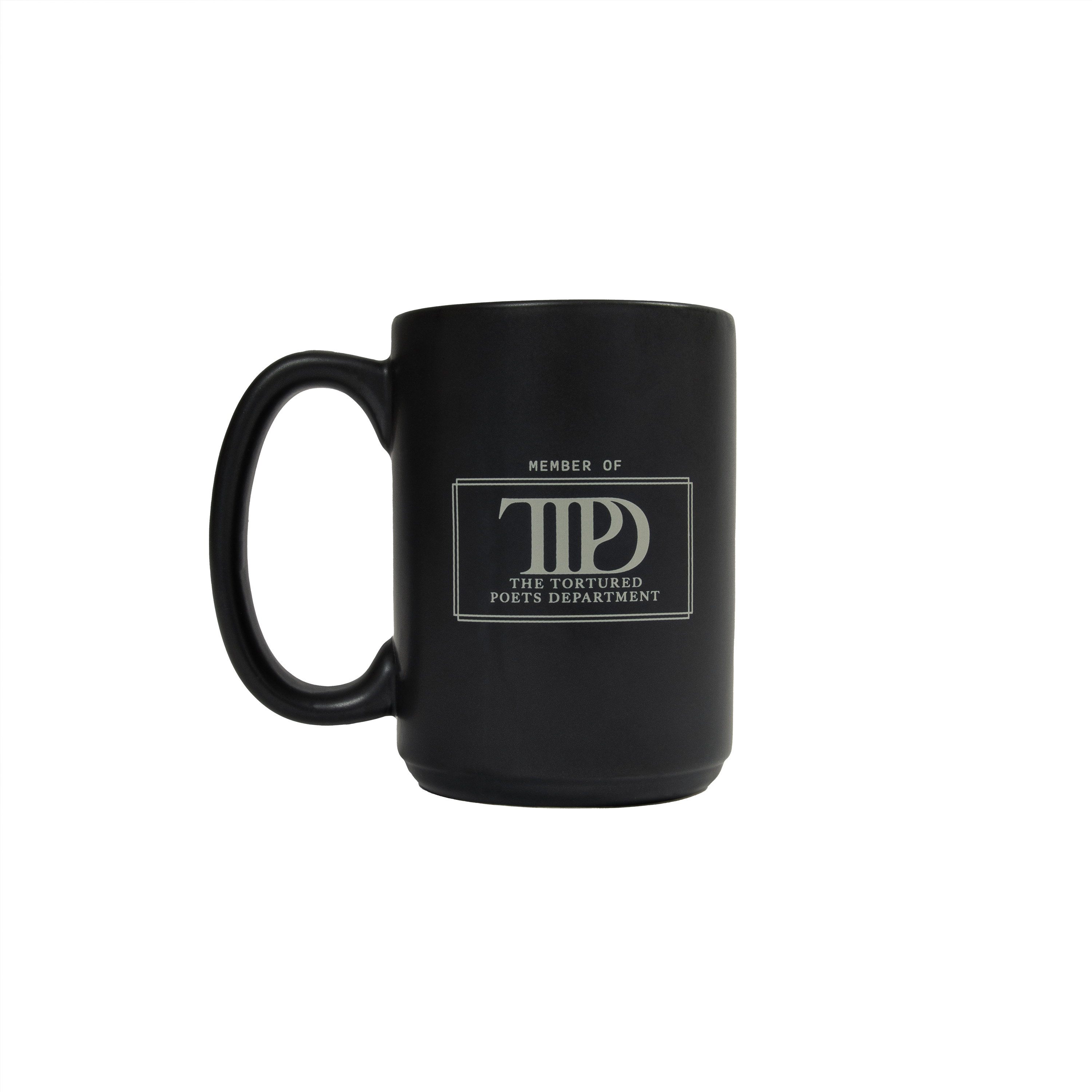 Tasse noire avec double ligne, "Member of", "TTPD" album logo et "The Tortured Poets Department" imprimés à l'avant et "Taylor Swift" imprimé à l'arrière avec motif encadré.