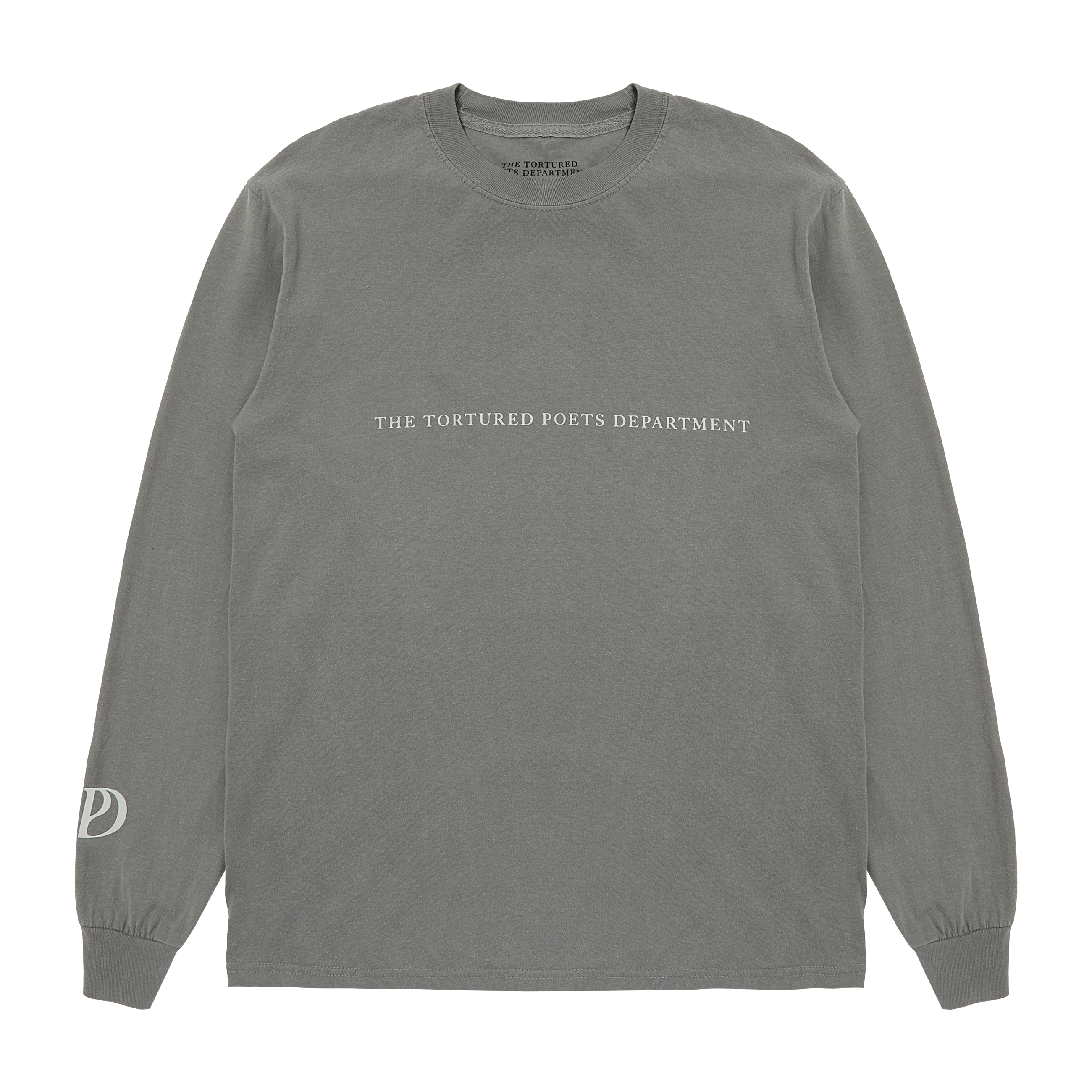 T-shirt gris à manches longues avec "The Tortured Poets Department" imprimé sur le devant et "TTPD" album logo imprimé sur la manche droite avec photo de Taylor Swift, "Taylor Swift", et liste de chansons et "TTPD" album logo imprimé au dos.