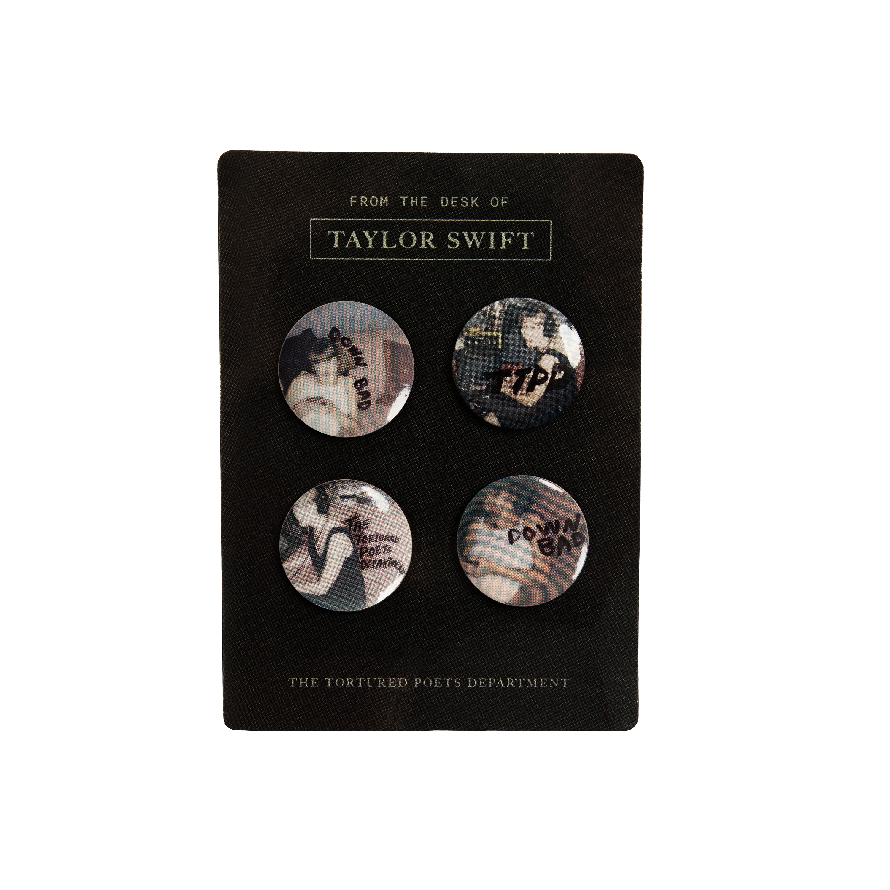 Lot de quatre pins avec des photos de Taylor Swift et des paroles de la chanson « Down Bad », « The Tortured Poets Department » et « TTPD » imprimés sur le devant avec une carte au dos avec « From The Desk of », « Taylor Swift » dans un motif encadré, et « The Tortured Poets Department » imprimés sur le devant de la carte.