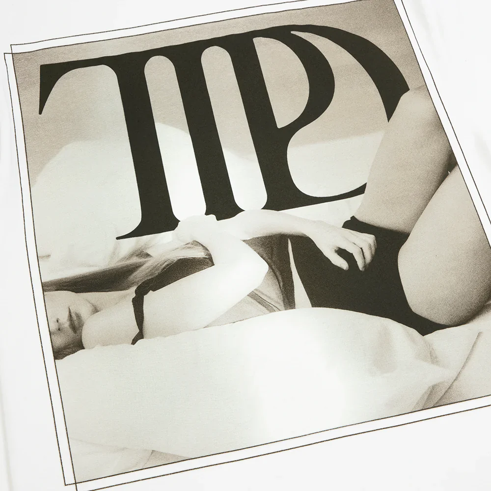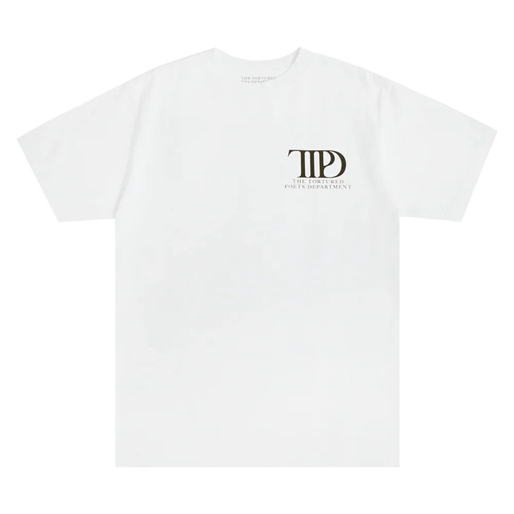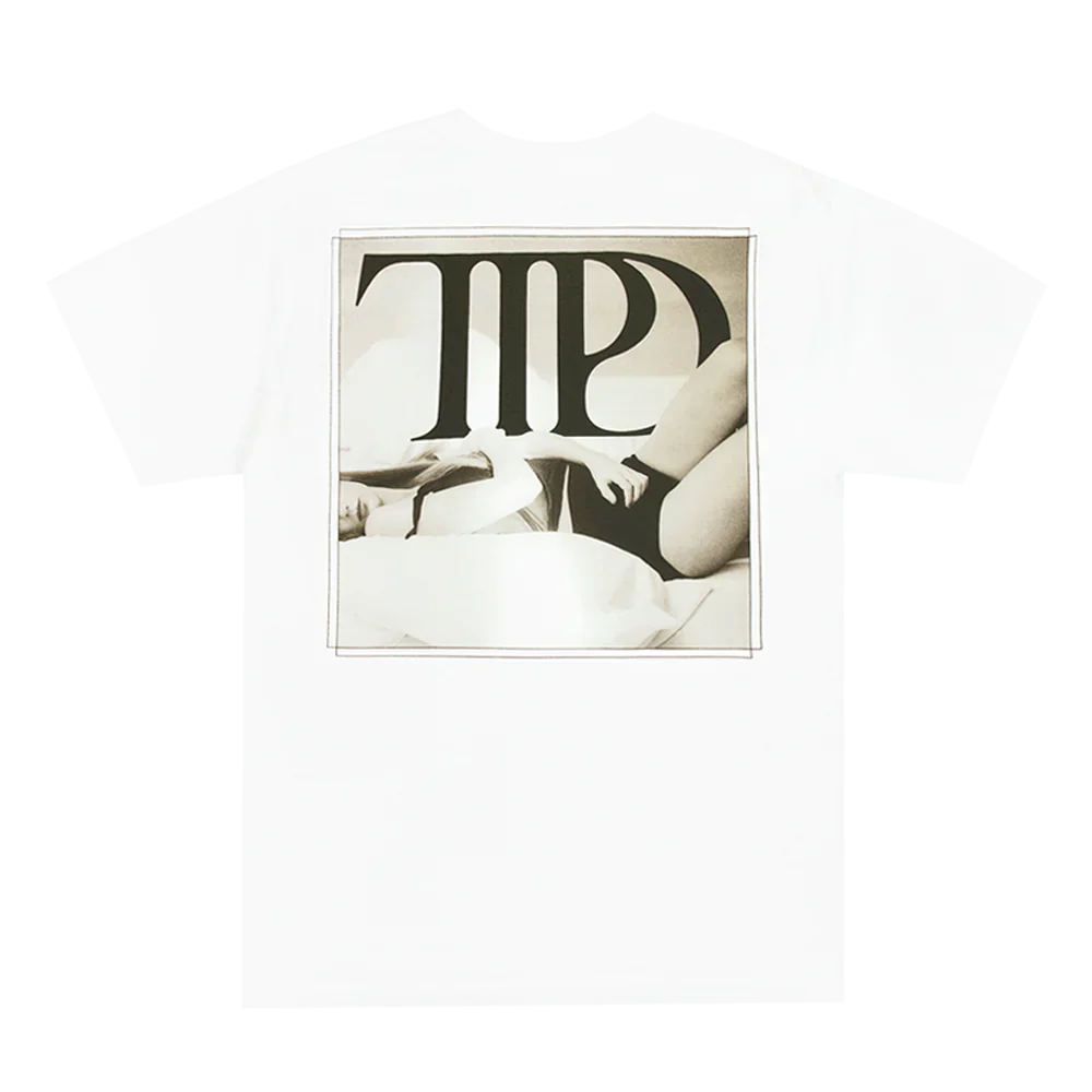 T-shirt blanc avec le logo de l'album "TTPD" et "The Tortured Poets Department" imprimés sur le devant de la poitrine gauche, ainsi qu'une photo de Taylor Swift et le logo de l'album "TTPD" imprimés au dos.