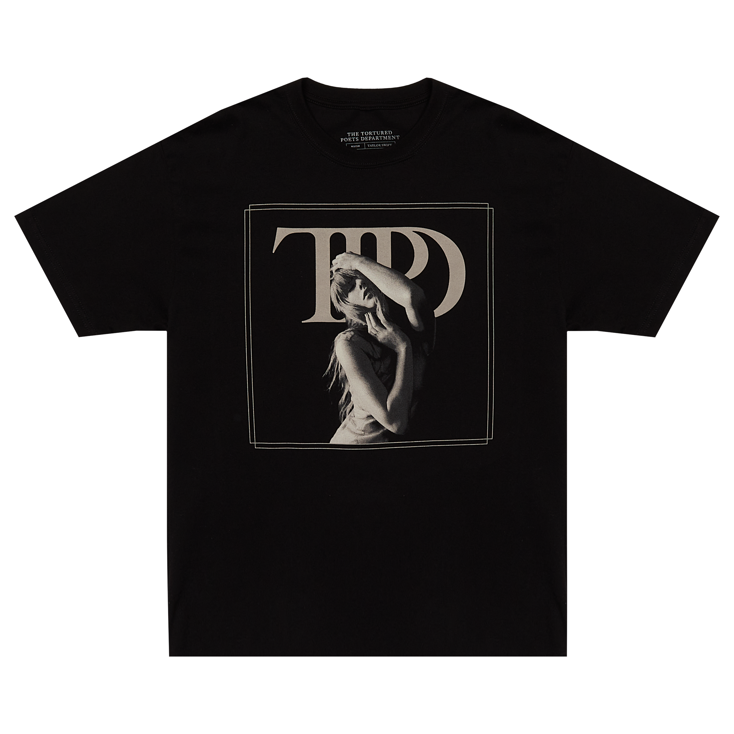 T-shirt noir avec photo de Taylor Swift et "TTPD" album logo imprimé sur le devant avec double encadrements.