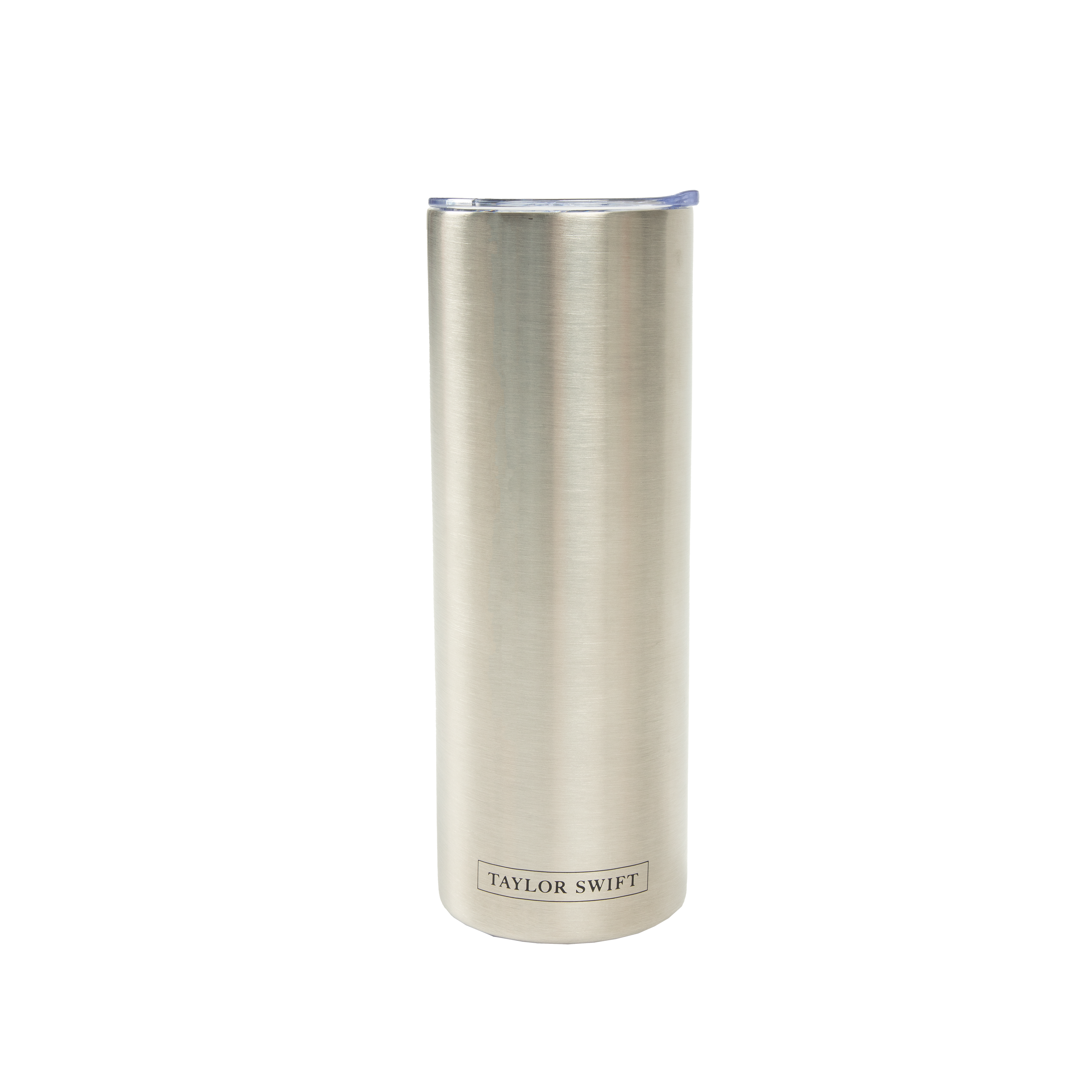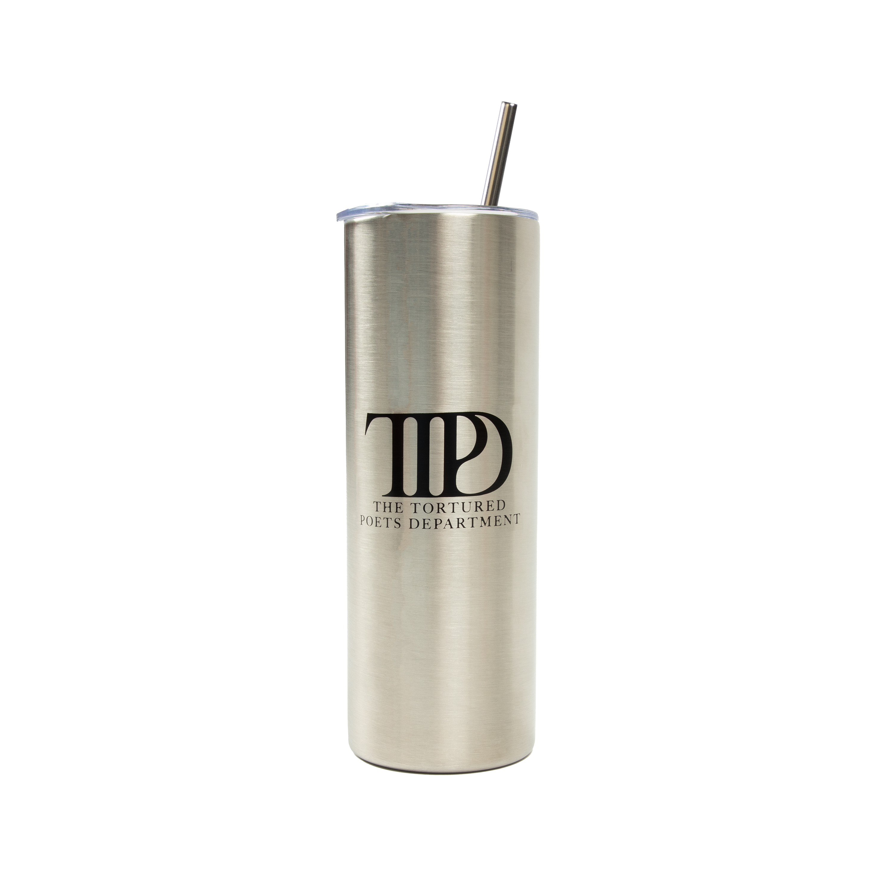 Gobelet en acier inoxydable avec couvercle et paille réutilisable portant le "TTPD" album logo et "The Tortured Poets Department » imprimés sur le devant et "Taylor Swift" avec le design de la boîte imprimé au dos.