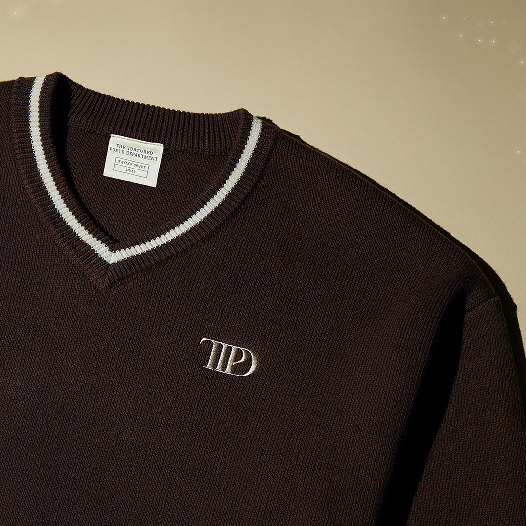 Pull marron à col en V avec logo TTPD brodé sur la poitrine gauche du porteur avec une bande blanche sur les poignets et l'encolure.