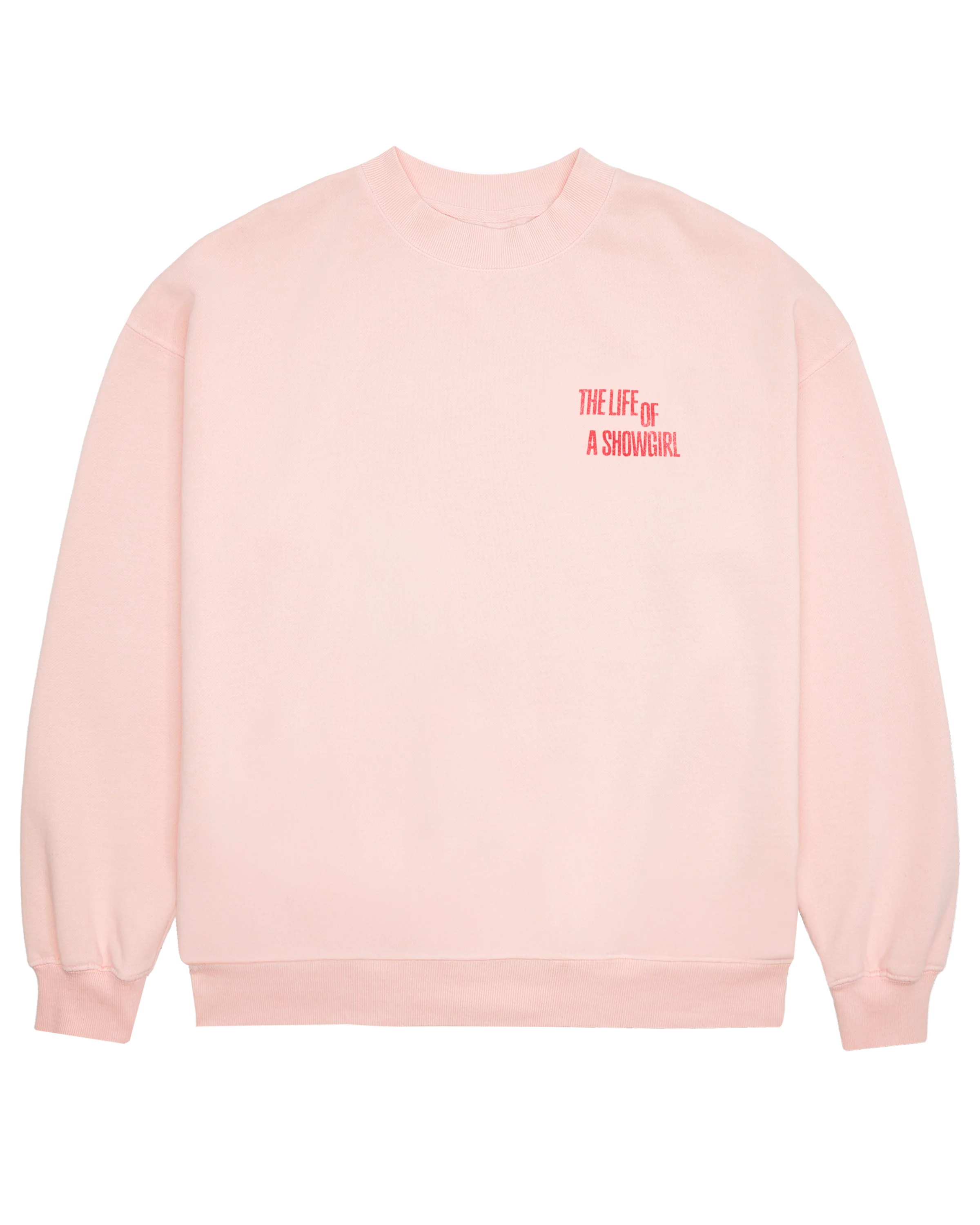Sweat-shirt rose à manches longues à col rond présentant le logo de l’album “The Life of a Showgirl” en strass rouges imprimé à l’avant et les paroles de la chanson “You Can Call Me Honey If You Want” en imprimé brillant rouge avec une photo de Taylor Swift imprimée au dos.