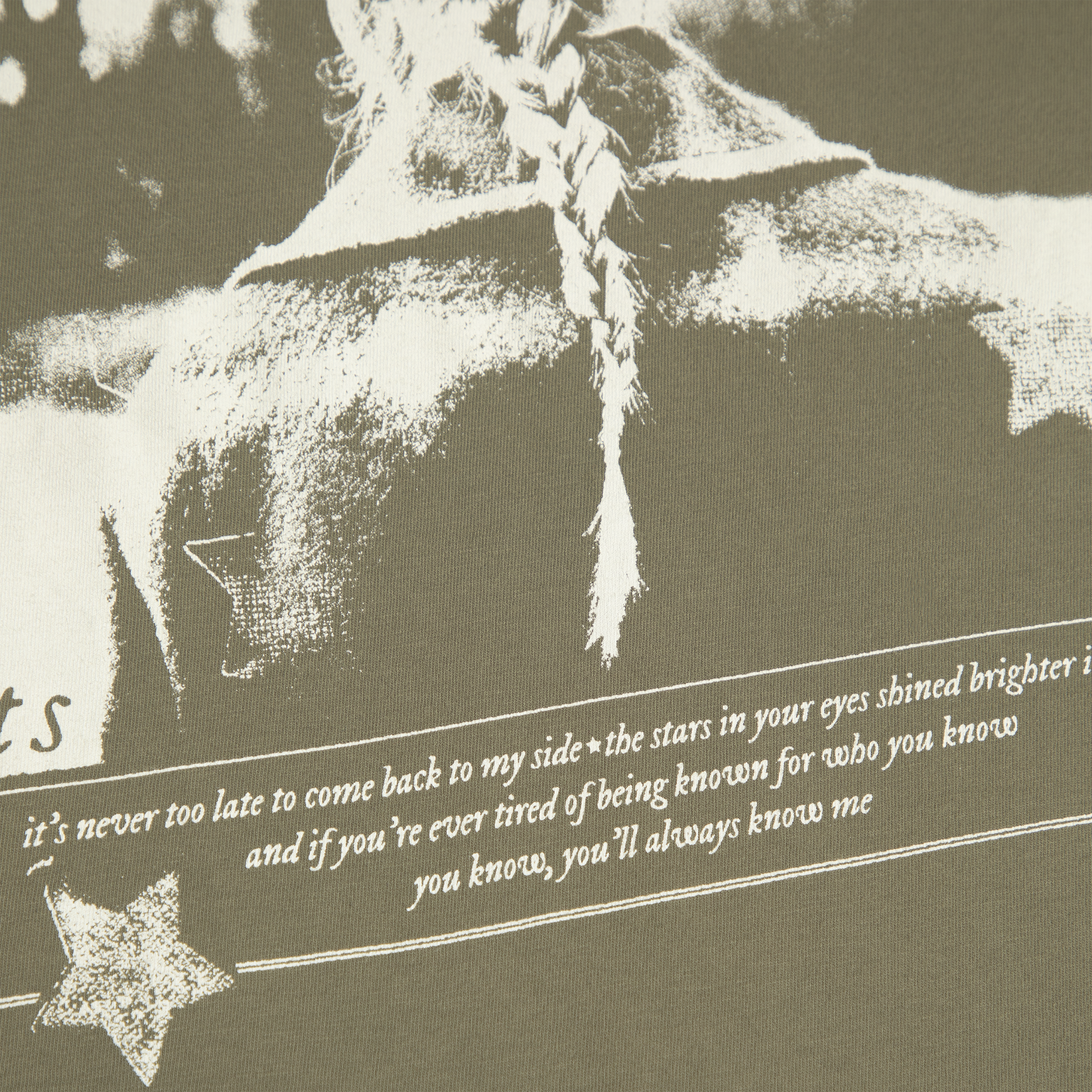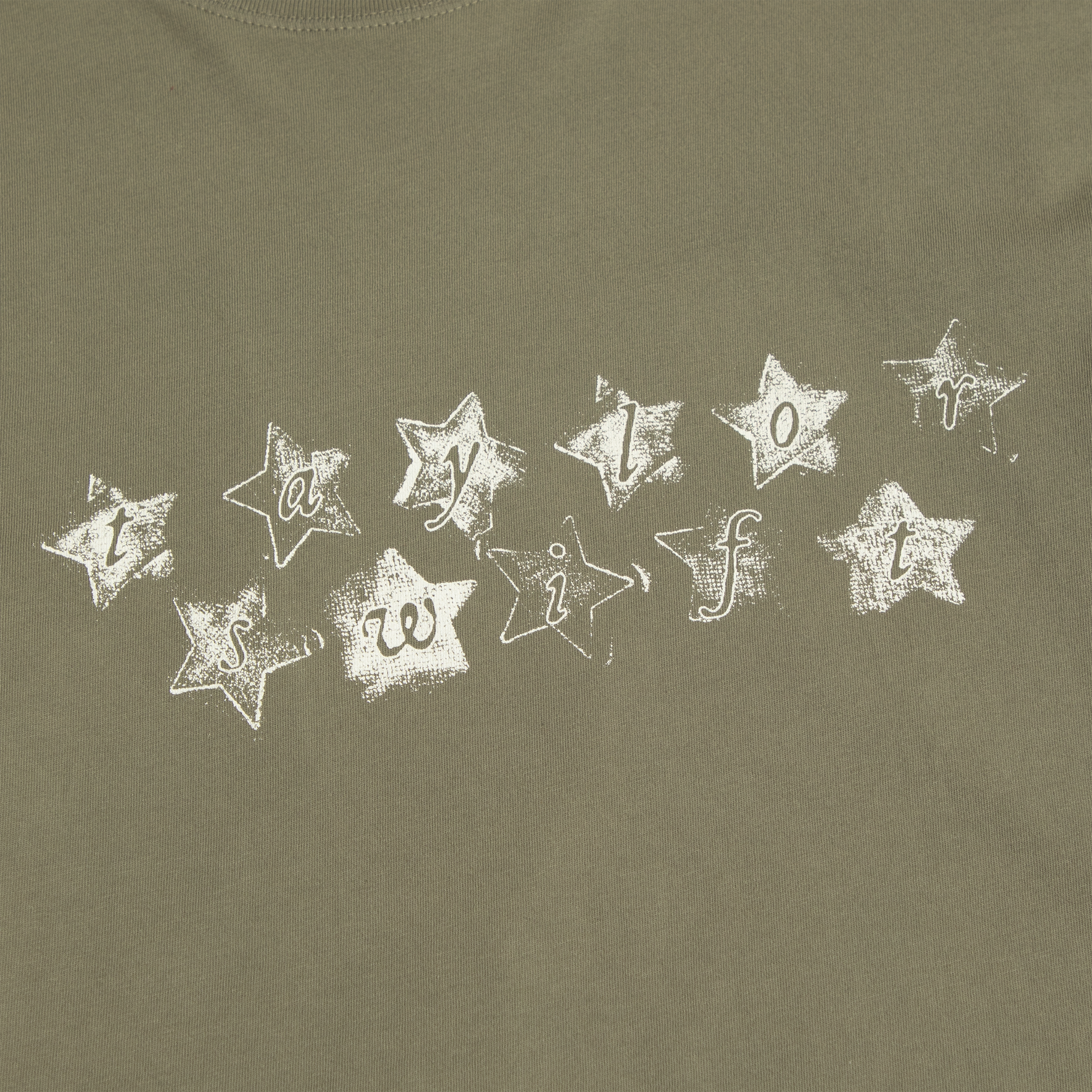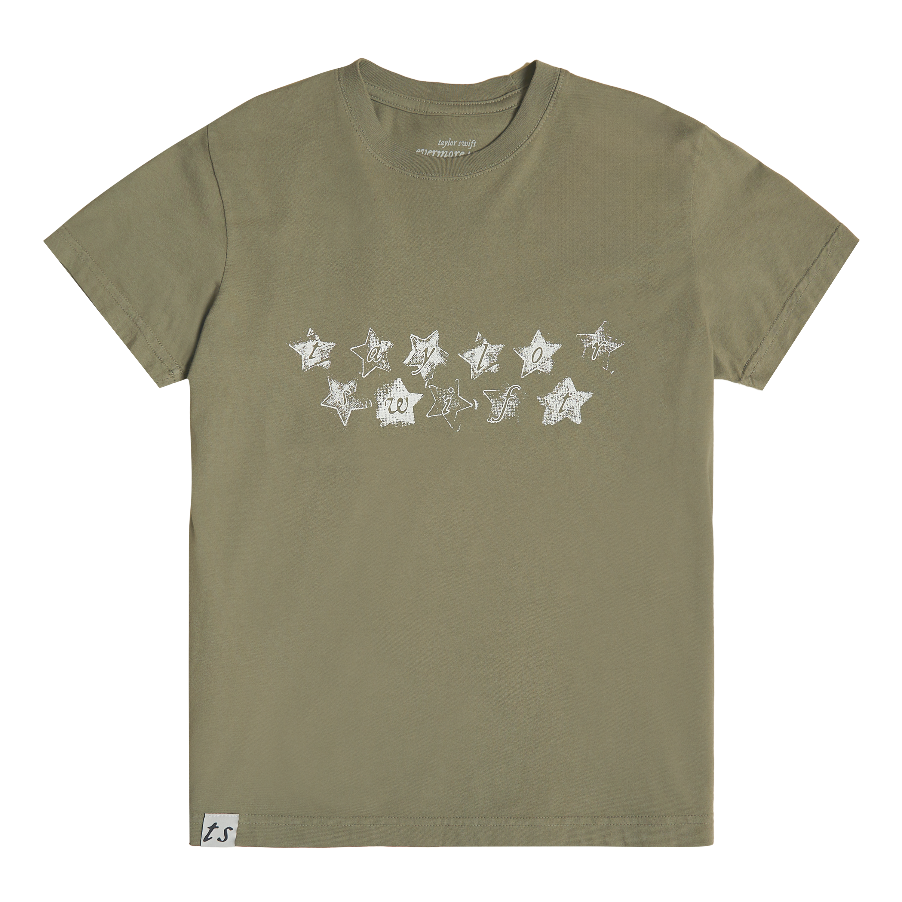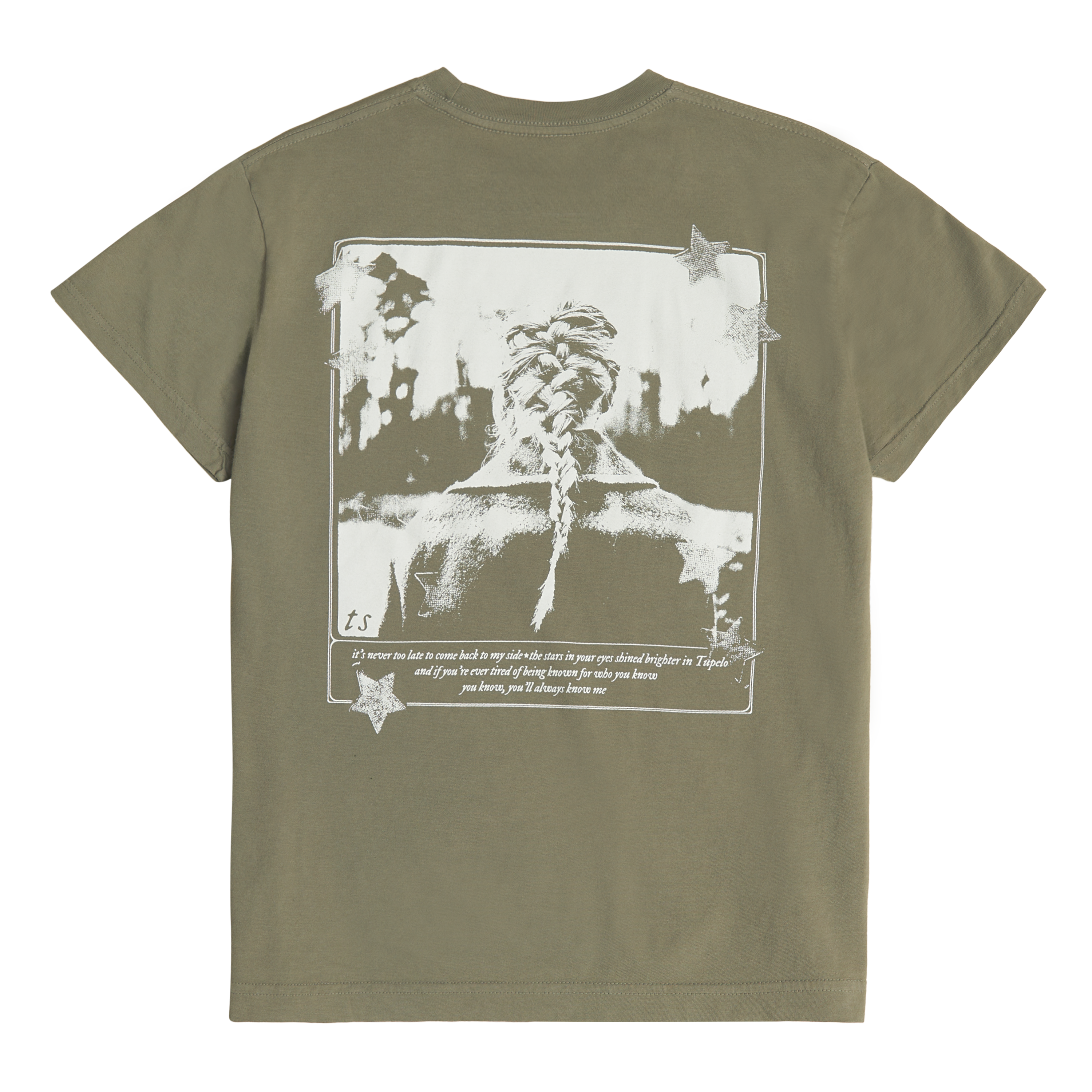 T-shirt olive avec motif étoile "Taylor Swift" imprimé sur le devant et patch "ts" cousu sur l'ourlet avant droit du porteur avec photo de Taylor Swift, "ts" et paroles de la chanson "it's never too late to come back to my side, the stars in your eyes shining brighter in Tupelo, and if you're ever tired of being known for who you know you know, you'll always know me" imprimées au dos avec motif étoile.